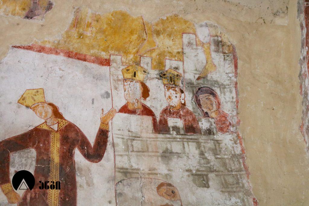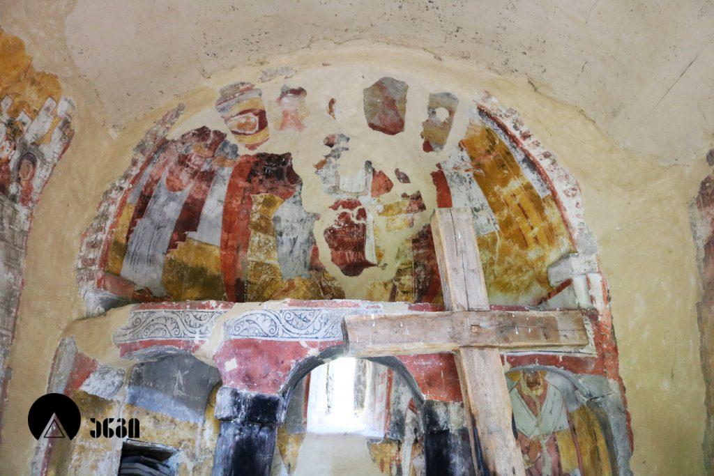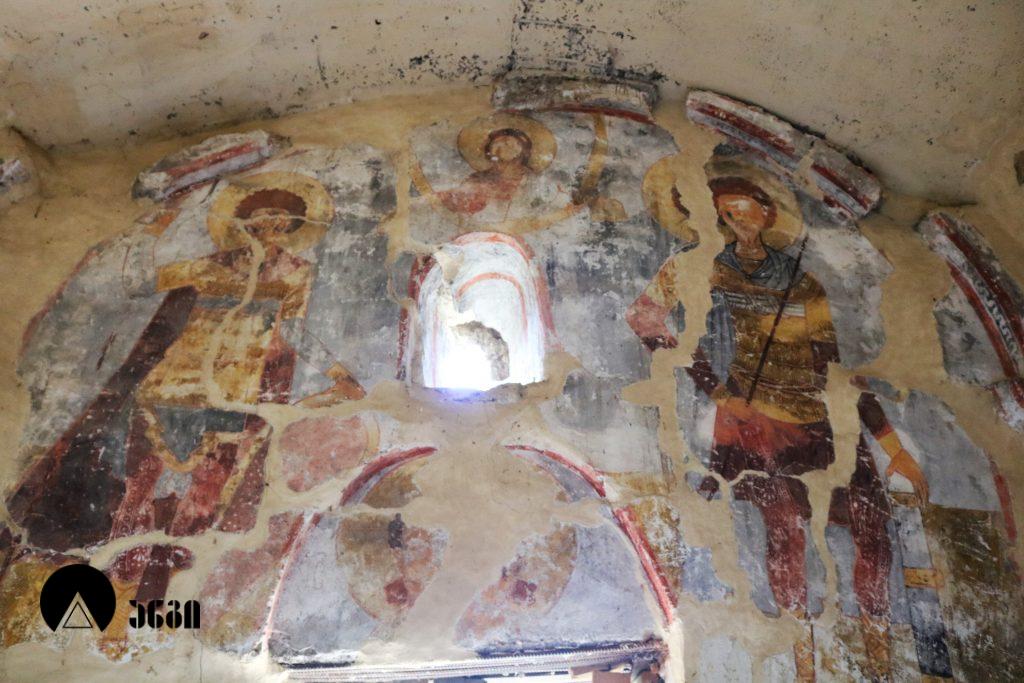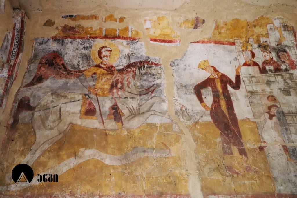 ადიშის წმ. გიორგის ეკლესიის ინტერიერი მთლიანად მოხატულია. ღია, ნათელი კოლორიტის მხატვრობა, რომელიც სრულად ეძღვნება წმ. გიორგის კულტს, ადგილობრივ ოსტატის მიერ არის შესრულებული. საკურთხევლის კონქში ვედრების სცენაა: ცენტრში გამოსახულია ტახტზე მჯდომარე ქრისტე კურთხევის ნიშნად აღმართული ხელით, ხოლო მის ორსავ მხარეს ღვთისმშობელი და იოანე ნათლისმცემელი. კედლის ქვემო ნაწილში წარმოდგენილნი არიან ეკლესიის მამანი; ასიმეტრიულად განლაგებული ფიგურებიდან მარცხენა მხარეს წმ. ბასილია, მარჯვენა მხარეს – იოანე ოქროპირი და კიდევ ერთი წმინდანი. დარბაზის კედლების ქვედა რეგისტრები წმ. გიორგის ცხოვრების ამსახველ სცენებს ეთმობა: ჩრდილოეთ კედელზე მოცემულია კომპოზიცია ,,ქალაქ ლასიას სასწაული“, რომელშიც ყურადღებას იქცევს მეფის ასულის ფიგურა, რომელსაც ცენტრალური ადგილი უჭირავს და საოცარი გრაციოზულობით გამოირჩევა; სამხრეთ კედელზე გამოსახულია – ,,სასწაული გადარჩენილი ბიჭით“. ხოლო დასავლეთ კედელზე წმ. გიორგის ამბების თხრობის დამამთავრებელი და საზეიმო განწყობის კომპოზიციაა მოცემული – ,,მაცხოვრის მიერ წმინდა მეომართა კურთხევა“: მედალიონში მოთავსებული, მკერდამდე გამოსახული ქრისტე გვირგვინით მოსავს წმინდა მეომრებს გიორგისა და თევდორეს, რომლებიც სიმეტრიულად ფლანკირებენ შესასვლელ კარს. იგივე მეომრები გამოსახულნი არიან მხედრების სახით ეკლესიის ჩრდილოეთ ფასადზე, რომელთა აპოტროფული დანიშნულების ფიგურებიც დასავლეთისკენ, სოფელში მიმავალი გზისკენ არის პირმიქცეული. ადიშის წმ. გიორგის სახელობის დარბაზული ეკლესია ძალიან მაღალი მხატვრულ-ისტორიული მნიშვნელობის ეროვნული ძეგლია.