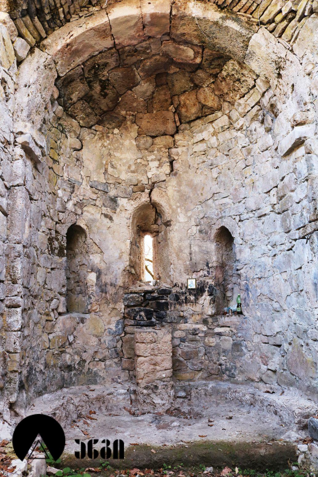 კვირიას ეკლესია დარბაზულ ნაგებობას წარმოადგენს სამხრეთისა და დასავლეთის მინაშენებით. დარბაზი ღრმა, ნახევარწრიული აფსიდით სრულდება, რომელიც დარბაზისგან ვიწრო მხრებითაა გამოყოფილი. კონქი მხრებზე გადასულ თაღს ეყრდნობა. აფსიდში გაჭრილი სარკმლის ორივე მხარეს მაღალი, ღრმა, თაღოვანი ნიშებია განლაგებული. აფსიდის კედელს ჩამოსაჯდომი საფეხური შემოუყვება. საკურთხეველი ერთი საფეხურითაა შემაღლებული. დარბაზის კედლები დაუნაწევრებელია, კამარა პირდაპირ კედლებს ეყრდნობოდა. დარბაზს საფეხური შემოსდევს. ინტერირი შელესილი ყოფილა. თავიდან ტაძარს მხოლოდ ერთი შესასვლელი ჰქონდა – სამხრეთიდან, რომელიც გარედან თაღოვანი ყოფილა, შიგნიდან კი არქიტრავული. მოგვიანებით მეორე შესასვლელი დასავლეთის კედელში გაუჭრიათ და დასავლეთითა და სამხრეთით ეკლესიისთვის დიდი თაღებით გახსნილი კარიბჭეები მიუშენებიათ. თაღები შირიმითაა გადაყვანილი. თაღთასაბჯენი კაპიტელებიც შირიმისაა და პროფილირებულია ორი ჰორიზონტალური ლილვით. უფრო გვიან ტაძრის სამხრეთის შესასვლელი და კარიბჭეების თაღები ამოუშენებიათ და დახურულ სათავსებად უქცევიათ. სამხრეთის კარიბჭეს აღმოსავლეთით ცრუ აფსიდი აქვს, რომელშიც ვიწრო, თაღოვანი სარკმელია გაჭრილი. ეკლესია აღმოსავლეთიდა და სამხრეთის სარკმლებით ნათდებოდა, სამხრეთის სარკმელი მინაშენის არეშია მოყოლილი და განათების წყაროს აღარ წარმოადგენს. ფასადები სადაა და წრეთარგის მოხაზულობის შირიმის ლავგარდნით სრულდება. ეკლესია ნაგებია კლდისა და შირიმის ქვით. ნაგებობა დახურულია ფიქლით, რომელზეც დუღაბით დაწყობილი იყო ბრტყელი და ღარიანი კრამიტი.