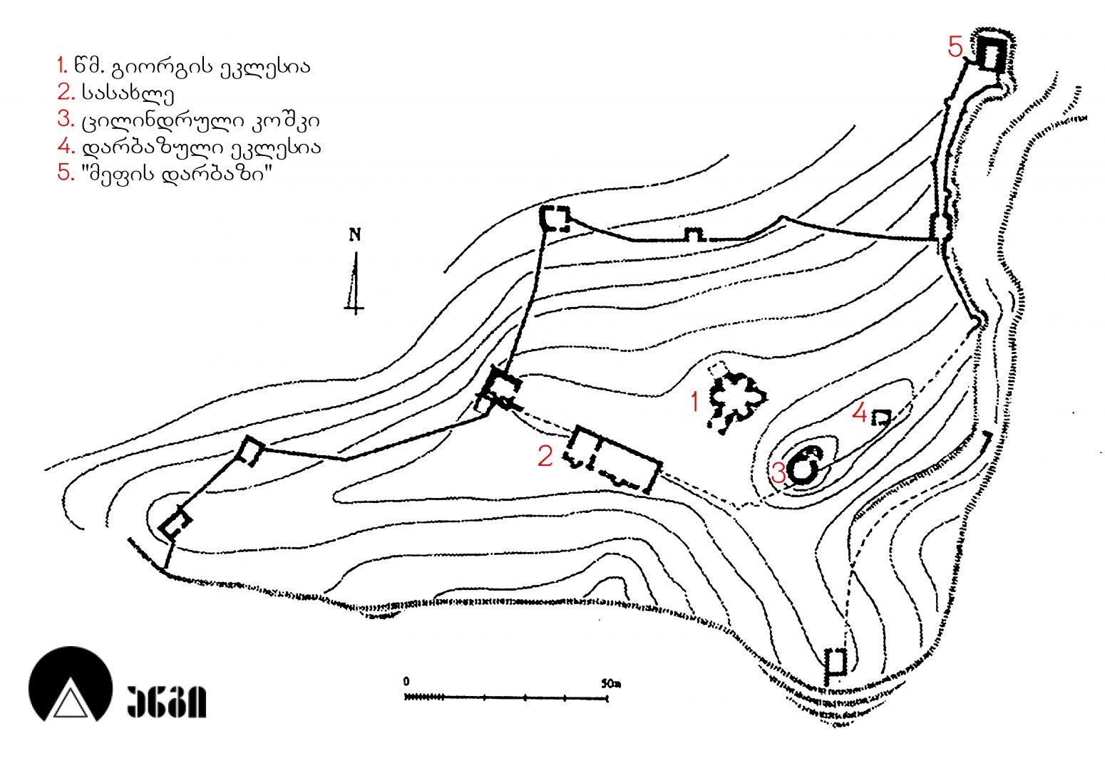 სასახლე შიდა ციხის სამხრეთ კედლის ხაზზე დგას, წმ. გიორგის ეკლესიის სამხრეთ-დასავლეთით. იგი სხვადასხვა ზომის ორი ოთახახისაგან შედგება, რომლებიც ერთმანეთს კარით უკავშირდება. აღმოსავლეთის ოთახის სამხრეთ კედლის შუაში ფართო და ღრმა ბუხარია, რომელიც ფასადზე კონტრფორსისმაგვარ შვერილს ქმნის. ბუხრის ორივე მხარეს თითო თაღოვანი სარკმელია. ასეთივე ოთახია დასავლეთ ოთახშიც, ბუხრის მარჯვნივ კი თაღოვანი სარკმელია. სასახლე ნაგებია ნატეხი ქვით.
