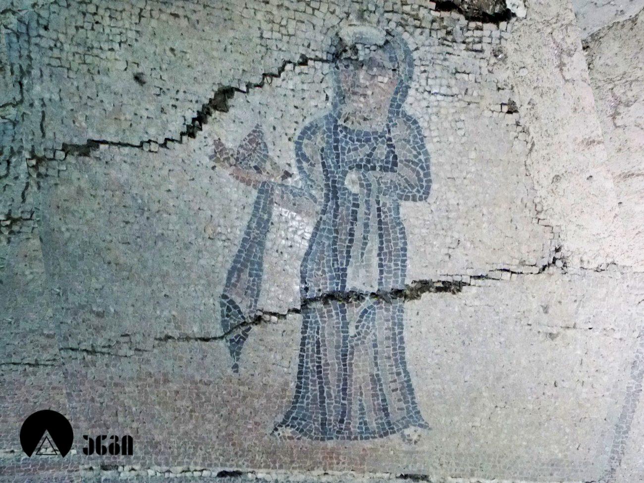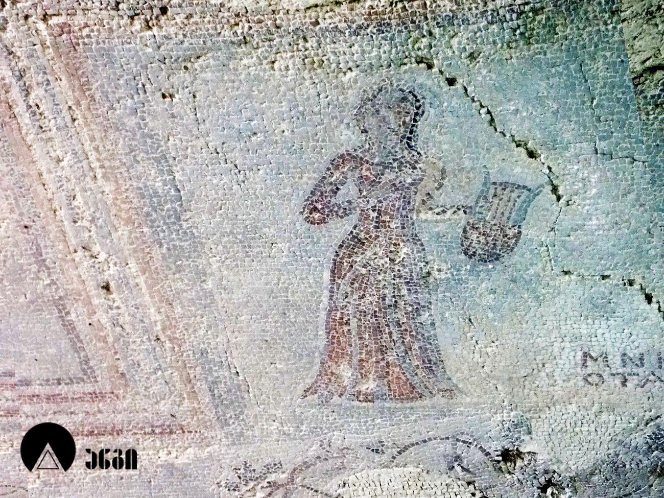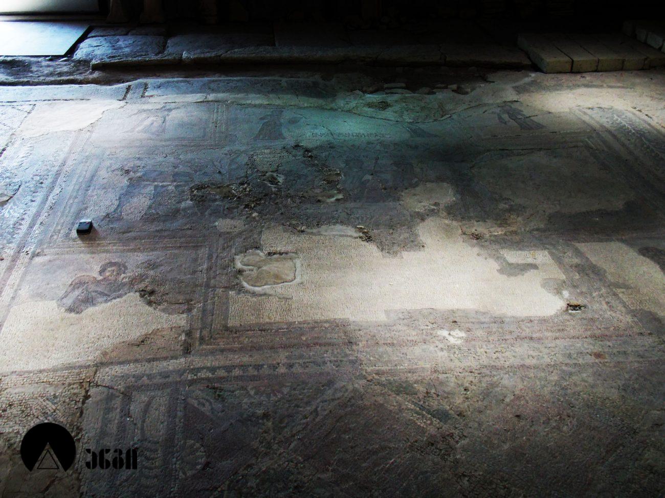 ტაძარი გეგმით სწორკუთხა ნაგებობაა და დარბაზისა და რამდენიმე დიდი სენაკისაგან შედგება. დარბაზს სამხრეთით საზეიმო შესასვლელი ჰქონდა. ზღურბლის წინ, ეზოს მხარეს ტუფისა და ქვიშაქვის თლილი ქვებით მოპირკეთებული მოედანია. დარბაზის იატაკს ახ. წ. II საუკუნით დათარიღებული მოზაიკა ამშვენებს, რომელიც თორმეტი ფერის კენჭებისაგან შედგება. კედლების გასწვრივ იატაკს შედარებით მსხვილი კენჭების მოზაიკური არშია შემოუყვება. მოზაიკის შუა ნაწილი ფართო, ტოლფერდიან ჯვარს წააგავს. ჰორიზონტალური მკლავის ცენტრალურ ნაწილში სიუჟეტური კომპოზიციაა, რომელზეც დიონისე და არიადნეა გამოსახული. მოზაიკა მთელი დარაბაზის იატაკს იკავებს და მრავალ გამოსახულებას მოიცავს. მოზაიკითა და თავად ნაგებობის ხასიათით სავარაუდოა, რომ საქმე გვაქვს ანტიკურ სამყაროში გავრცელებულ ე.წ. “დიონისეს სახლთან”. მოზაიკის ნაკვთების იკონოგრაფიას, ორნამენტების რეპერტუარსა და სტილს მოზაიკური ხელოვნების ანტიოქიის სკოლასთან აკავშირებენ.