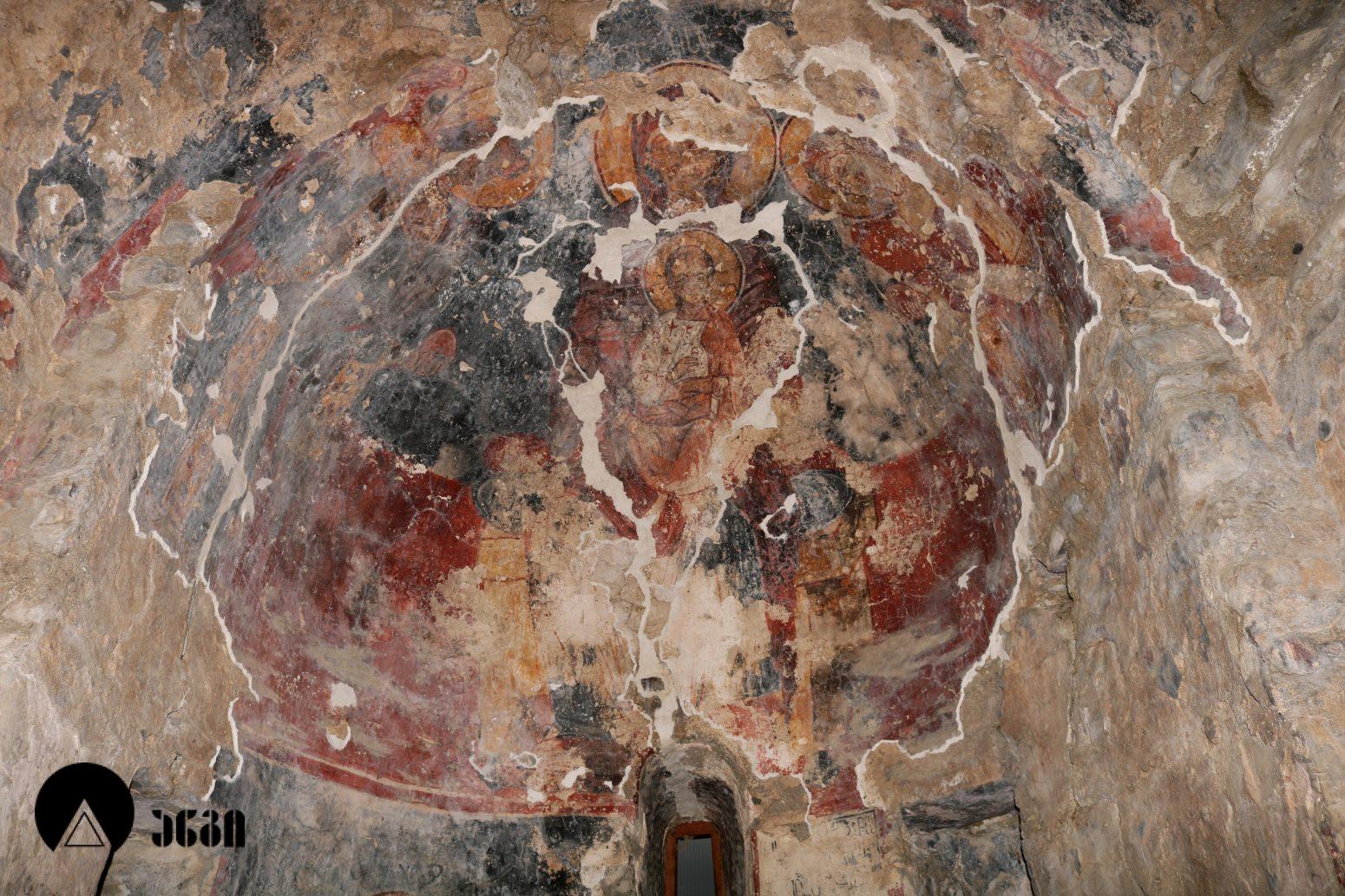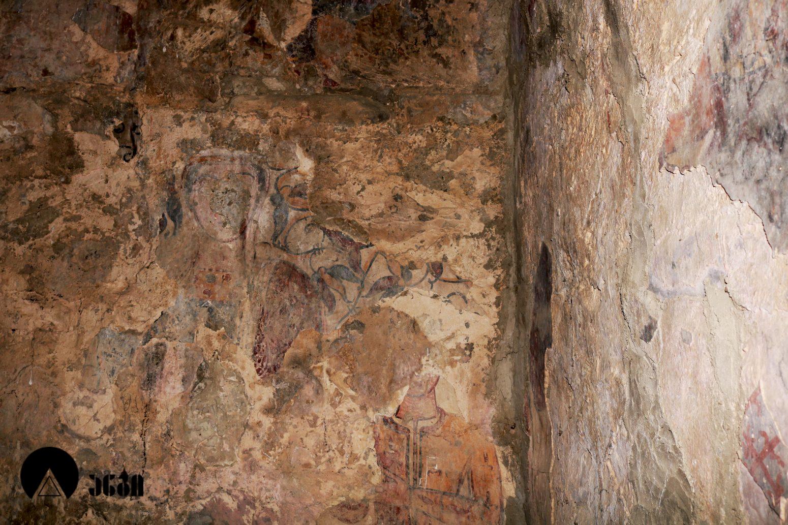 ტაძრის ინტერიერში შემორჩენილია გვიანი შუა საუკუნეების ძალიან დაზიანებული ე.წ. “ხალხური” რიგის მხავრობა. კონქში გამოსახულია ღვთისმშობელი ყრმით და ორი მთავარანგელოზი, საკურთხევლის მეორე რეგისტრში კი – მსხვერპლის თაყვანისცემა. საკურთხეველში გვხვდება ვინმე ლალასშვილის სულის მოსახსენიებელი ექვსსტრიქონიანი ასომთავრული დაზიანებული წარწერა. ბემის კამარაში ორი წმინდანია გამოსახული. ჩრდილოეთ მკლავის აფსიდის კონქში წმინდანი ქალის გამოსახულებაა. აფსიდის მეორე რეგისტრში გამოსახული იყო ეკლესიის ორი მამა. ჩრდილოეთ მკლავის ჩრდილოეთ კედლის დასავლეთ მონაკვეთი, დასავლეთ კედელი და დასავლეთ მკლავის ქვედა რეგისტრი ისტორიულ პირთა ფიგურებს ეთმობოდა. ჩრ. მკლავის ჩრ. კედელზე შემორჩენილია წარწერა, სადაც განირჩევა სახელი “ამარინდო”. ქტიტორის გამოსახულება, საყდრის სქემატური მოდელით ხელში, გამოსახულია დასავლეთ მკლავის ჩრდილოეთ კედელზე. სამხრეთ მკლავის სამხრეთ კედელზე ფრაგმენტია შემორჩენილი – მჯდომარე ქალი ყრმით. ჩრდილო-აღმოსავლეთ ტრომპში მახარებლის წელსზევითი გამოსახულებაა. ეკლესიის აღმოსავლეთ ფასადზე შემორჩენილია საფასადო მოხატულობის მცირე კვალიც, რაც სვანეთის გარეთ იშვიათია.