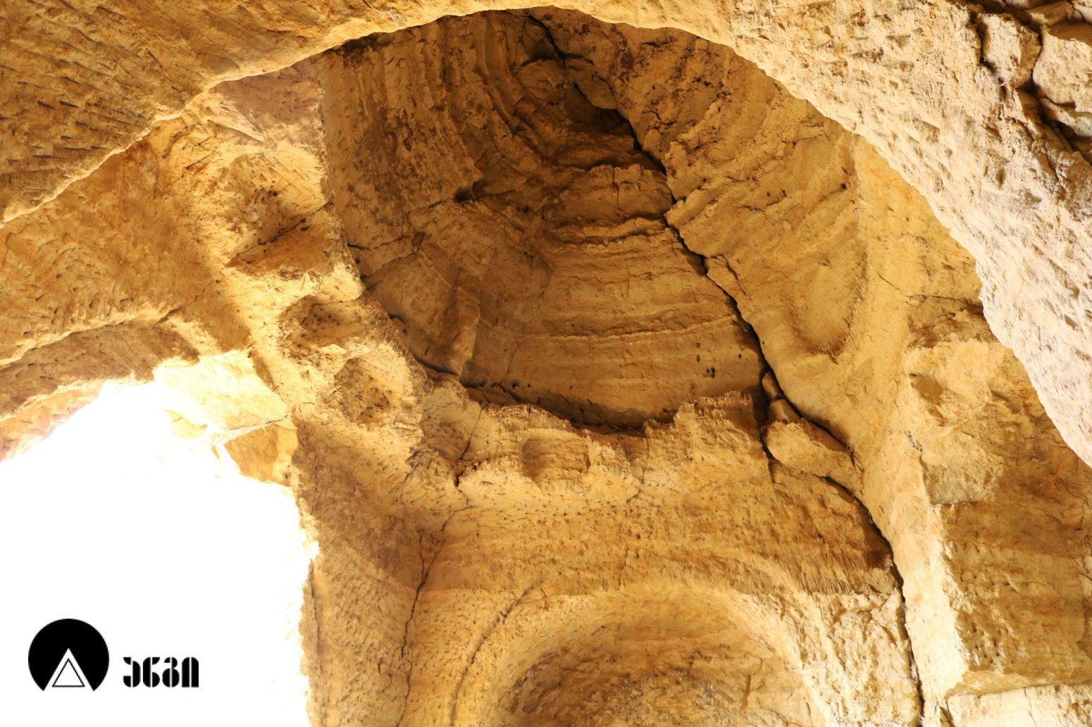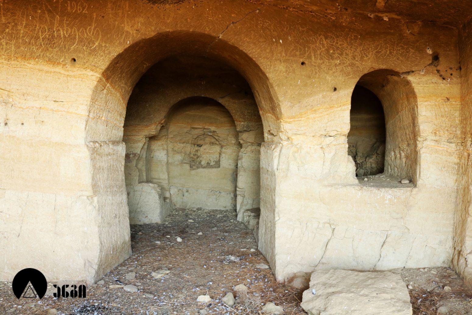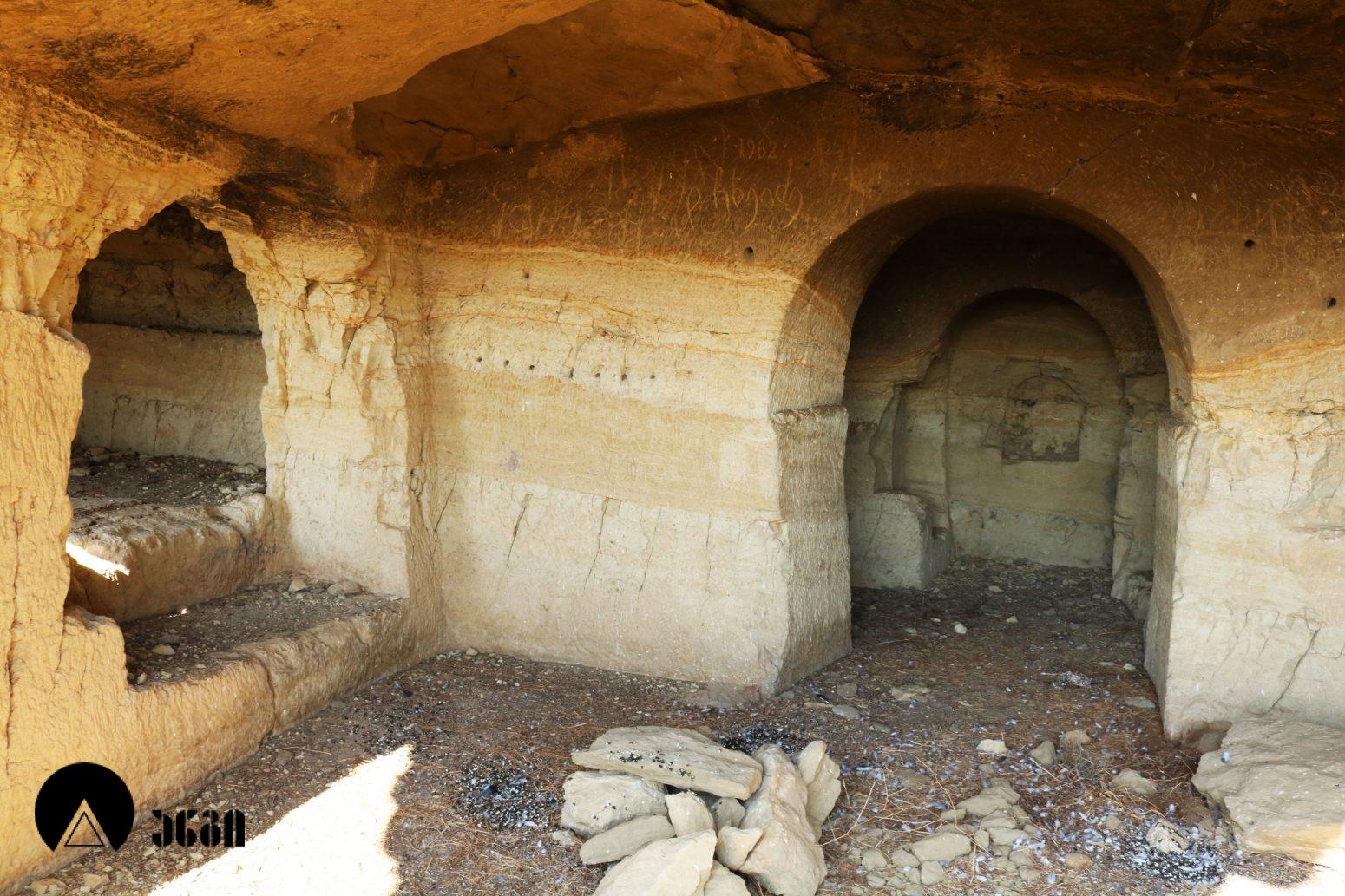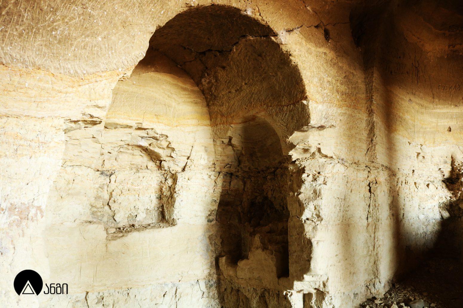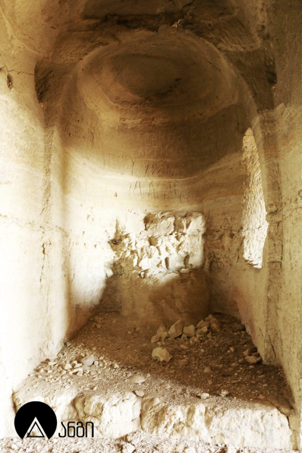 აფსიდიანი ეკლესია ორი განყოფილებისგან შედგება, რომლებიც ერთმანეთს დიდი თაღოვანი ღიობით უკავშირდება. ღიობის თაღი, ქვედა ნაწილთან შედარებით, უფრო განიერია და თაღის ვიწრო თაროებით აქცენტირება ხდება. გამყოფ კედელში, გასასვლელის აღმოსავლეთით თაღოვანი სარკმელია გაჭრილი. პირველი განყოფილების აღმოსავლეთ კედელში გეგმაში სწორკუთხა, თაღოვანი, დიდი, საკმაოდ ღრმა ნიშაა. ქვაბულის გადახურვა, ცენტრში შემაღლებულია განივ (ჩრდილოთ-სამხრეთ) ღერძზე. კედლებს ჩამოსაჯდომი საფეხური მიუყვება. მეორე განყოფილებას აღმოსავლეთით ღრმა აფსიდი აქვს, რომელიც ერთი საფეხურითაა შემაღლებული. საკურთხეველში ტრაპეზია. სამლოცველოს ჩრდილოეთ კედელში ღრმა, დიდი თაღოვანი ნიშია, რომლის სამივე კედელში მცირე თაღოვანი ნიშია გამოკვეთილი, აღმოსავლეთისა და დასავლეთის ნიშები თანაბარი სომაღლისაა, ჩრდილოეთისა კი უფრო დაბალია. აღმოსავლეთის ნიში პატარა საკურთხეველს წარმოადგენს. პირველი განყოფილება დასავლეთით თაღოვანი ღიობითა და ორსაფეხურიანი კიბით ორნაწილიან სათავსს უკავშირდება. სათავსი სამეურნეო დანიშნულებისა უნდა ყოფილიყო, მის იატაკში რამდენიმე ორმოა. ეკლესიის აღმოსავლეთით ორგანყოფილებიანი ქვაბულია, რომლის კედლებში თაროებია გამოკვეთილი.