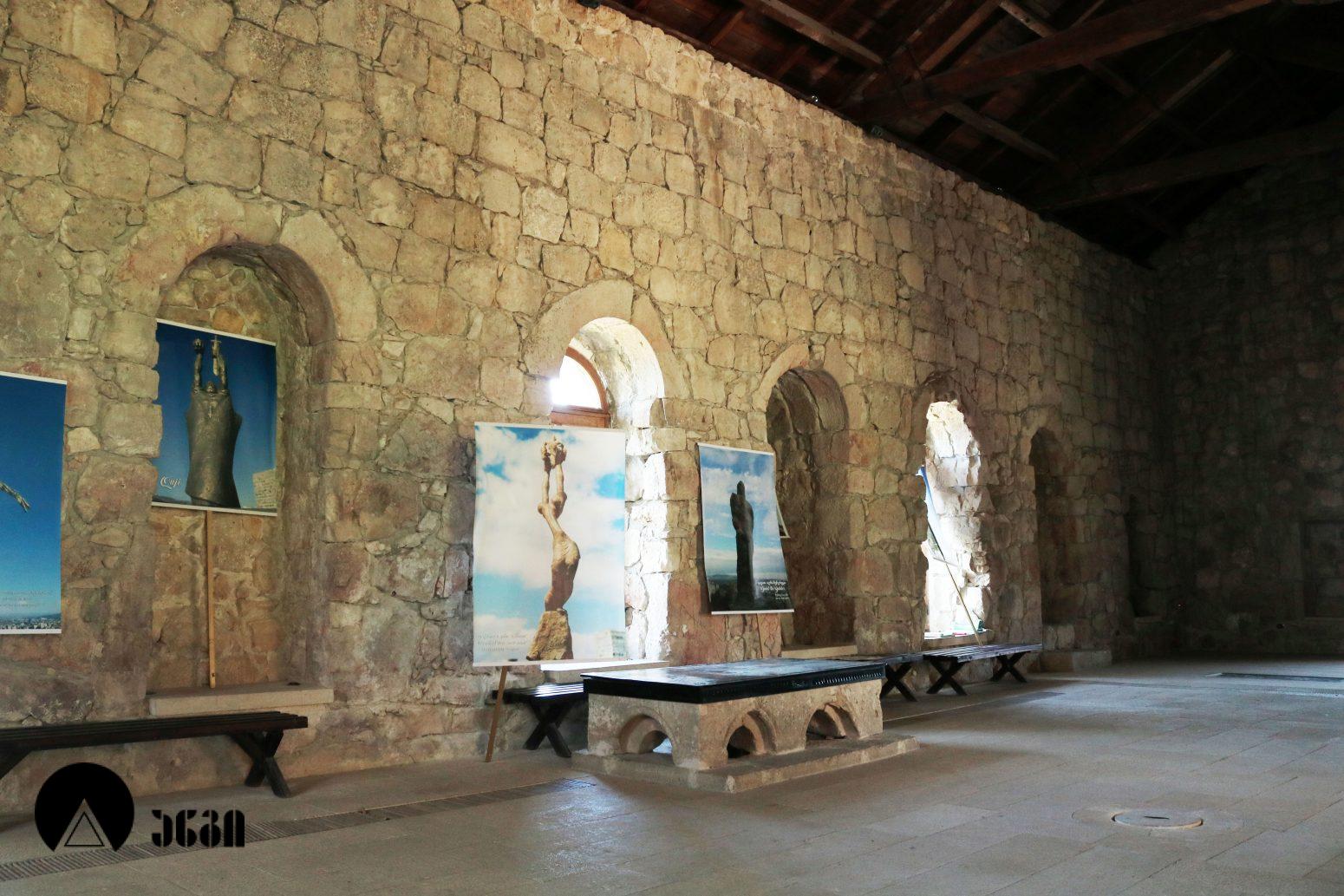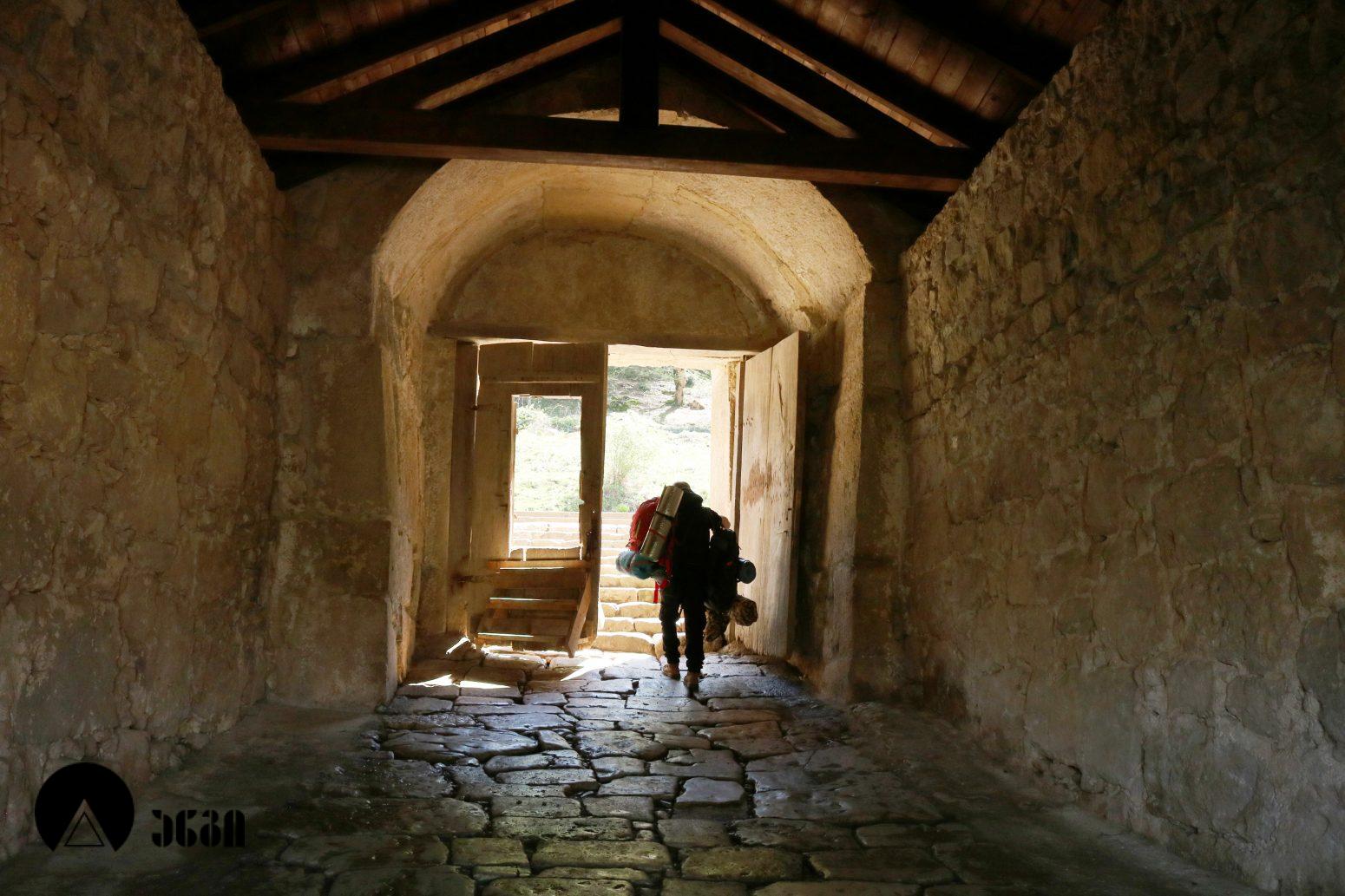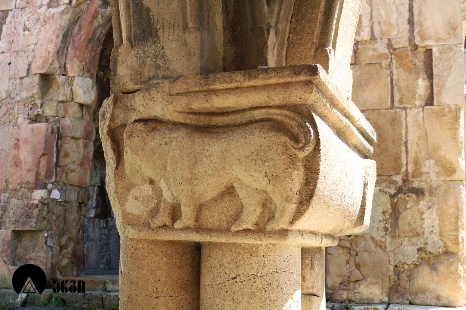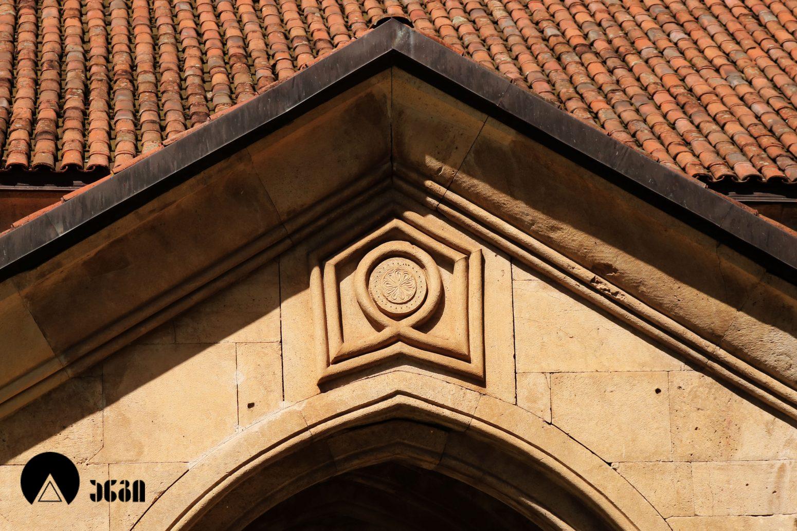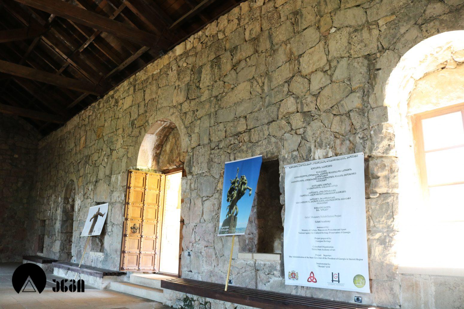 გელათის აკადემიის შენობის შესასვლელს მდიდრულად გაფორმებული ოთხსვეტიანი კარიბჭე აქვს, რომლის თაღებიც სხვადასხვა ფორმის ოთხ ბოძს ეყრდნობა. თაღები მოჩუქურთმებულია. ერთ-ერთი ბოძის კაპიტელზე ამოკვეთილია ლომი. კარიბჭე დიდ დარბაზს უკავშირდება. კედლების გასწვრივ ქვის დასაჯდომებია, რომლებიც აკადემიის მსმენელთათვის იყო გათვალისწინებული. დარბაზის ჩრდილო-დასავლეთით შუა კედელთან დგას თაღებიანი ოთკუთხა მაგიდა. ნაგებობის შიდა სივრცე კარგადაა განათებული.