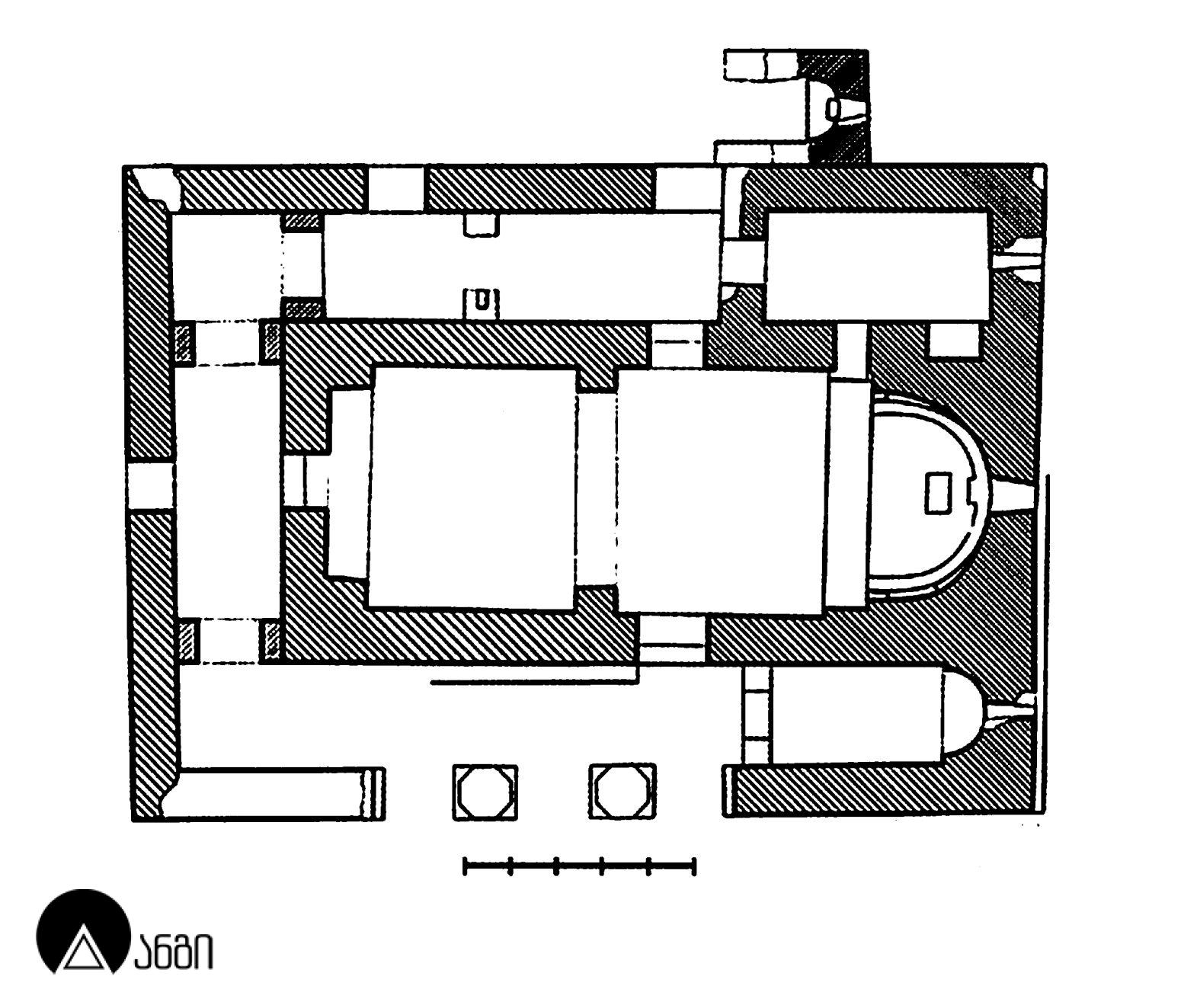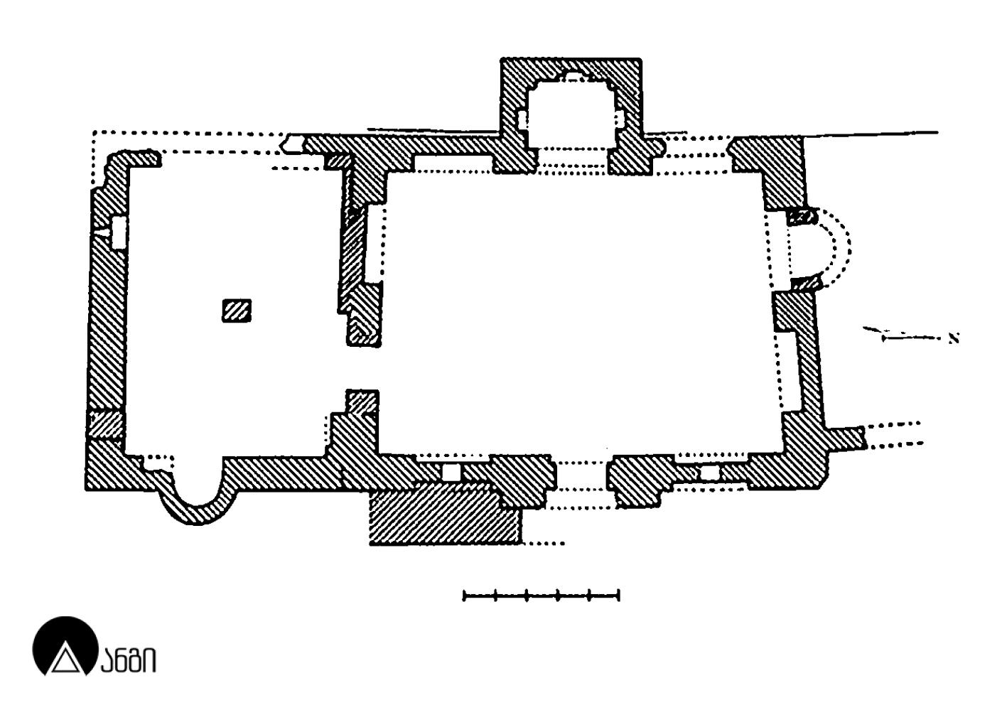 ეკლესიის დასავლეთით სატრაპეზო დგას. ნაგებობა სამხრეთ-ჩრდილოეთ ღერძზეა წაგრძელებული და ორი სათავსისგან შედგება. სატრაპეზოს შესასვლელი არმოსავლეთიდან აქვს. შესასვლელი თაღოვანია და ინტერიერის მხრიდან მოქცეულია სიბრტყის შეწევით მიღებულ სწორკუთხედში, გარედან კი – დიდ თაღში, რომელიც პატარა, ერთმანეთზე გადაბმული თაღების მწკრივითაა დეკორირებული. შესასვლელის თავზე სიბრტყის შეწევით მიღებული ჯვარია გამოსახული. ჩრდილოეთით მდებარე სათავსიუფრო დიდია. სათავსები ერთმანეთთან სქელი კედლითაა გამიჯნული, რომელშიც ორი მაღალი და განიერი ოდნავ შეისრულთაღოვანი ღიობია მოწყობილი. აღმოსავლეთით მდებარე ღიობი მოგვიანებით აგურით ამოუშენებიათ და დაბალი სწორკუთხა გასასვლელი მოუწყვიათ. ასეთივე მოხაზულობის ორ-ორი ყრუ თაღითაა დეკორირებული დარბაზის დასავლეთის, აღმოსავლეთისა და ჩრდილოეთის კედლები. დეკორატიულ თაღებში თითო თაღოვანი სარკმელია გაჭრილი. დასავლეთის თაღებს შორის მაღალი და განიერი, ოდნავ შეისრული ღია თაღია, რომლითაც დარბაზი პატარა განცალკევებულ სათავსს უკავშირდება. თაღი დარბაზის მხრიდან ორსაფეხურიანია, შირიმის მარტივპროფილიან იმპოსტებს ეყრდნობა და გაფორმებულია პატარა, ერთმანეთზე ბოლოებით გადაბმული ნახევარწრიული თაღების უწყვეტი მწკრივით, სატრაპეზოს შესასვლელის თაღის მსგავსად. სათავსი შენობის დასავლეთ კედლის ხაზიდან მთლიანად გარეთაა გასული და დამოუკიდებელი ორფერდა გადახურვა აქვს. ოთახი გადახურულია ოდნავ შეისრული კამარით, რომლის მთელი ზედაპირი დამუშავებულია წყობაში ოდნავ შეღრმავებული და ერთმანეთზე მიყრდნობილი რომბებით. კამარა დასავლეთით ნახევარპილასტრებზე (პილასტრებისგან მცირე ნაწილია შემორჩენილი) გადაყვანილ საბჯენ თაღს ეყრდნობა. თაღის ქუსლებთან გამოყოფილია შირიმის მაღალი იმპოსტები, რომელთა პროფილს თარო და ოდნავ შეზნექილი ზედაპირი ქმნის. სათავსის დასავლეთ კედლის ქვედა ნაწილში ორი საფეხურით შეღრმავებული თაღოვანი ნიშია. ნიშის ზემოთ თაღოვანი სარკმელი ყოფილა. სამხრეთისა და ჩრდილოეთის კედლებზე თითო დეკორატიული თაღია. კონსტრუქციის მდგრადობის მიზნით სათავსის კედლები დარბაზის კედლებთან წყობაში დატანებული ხის ძელებით ყოფილა დაკავშირებული. დარბაზის ჩრდილოეთის კედლის ერთ თაღში, როგორც ჩანს, ადრე დარბაზზე ჩრდილოეთიდან მიშენებულ ნაგებობაში გასასავლელი კარი ყოფილა, რომელიც მოგვიანებით გაუუქმებიათ და მის ნაცვლად ბუხარი მოუწყვიათ. დარბაზს ხის კოჭოვანი გადახურვა ჰქონია. ინტერიერში შემორჩენილია გრძელი მაგ