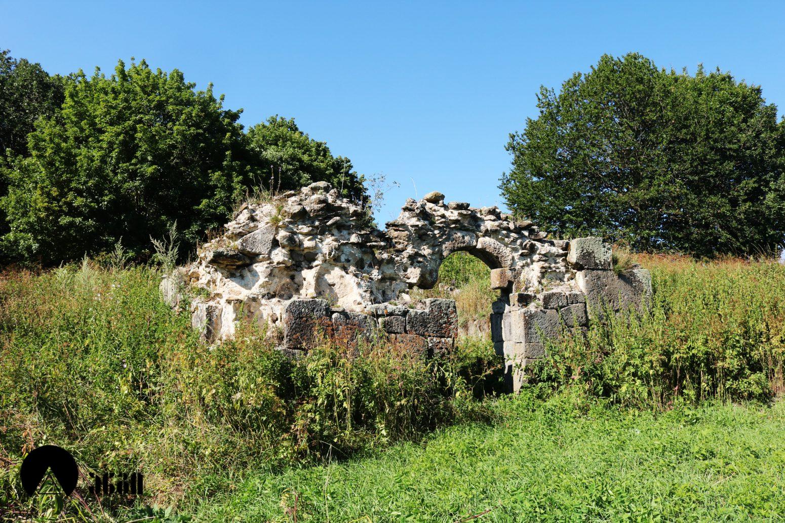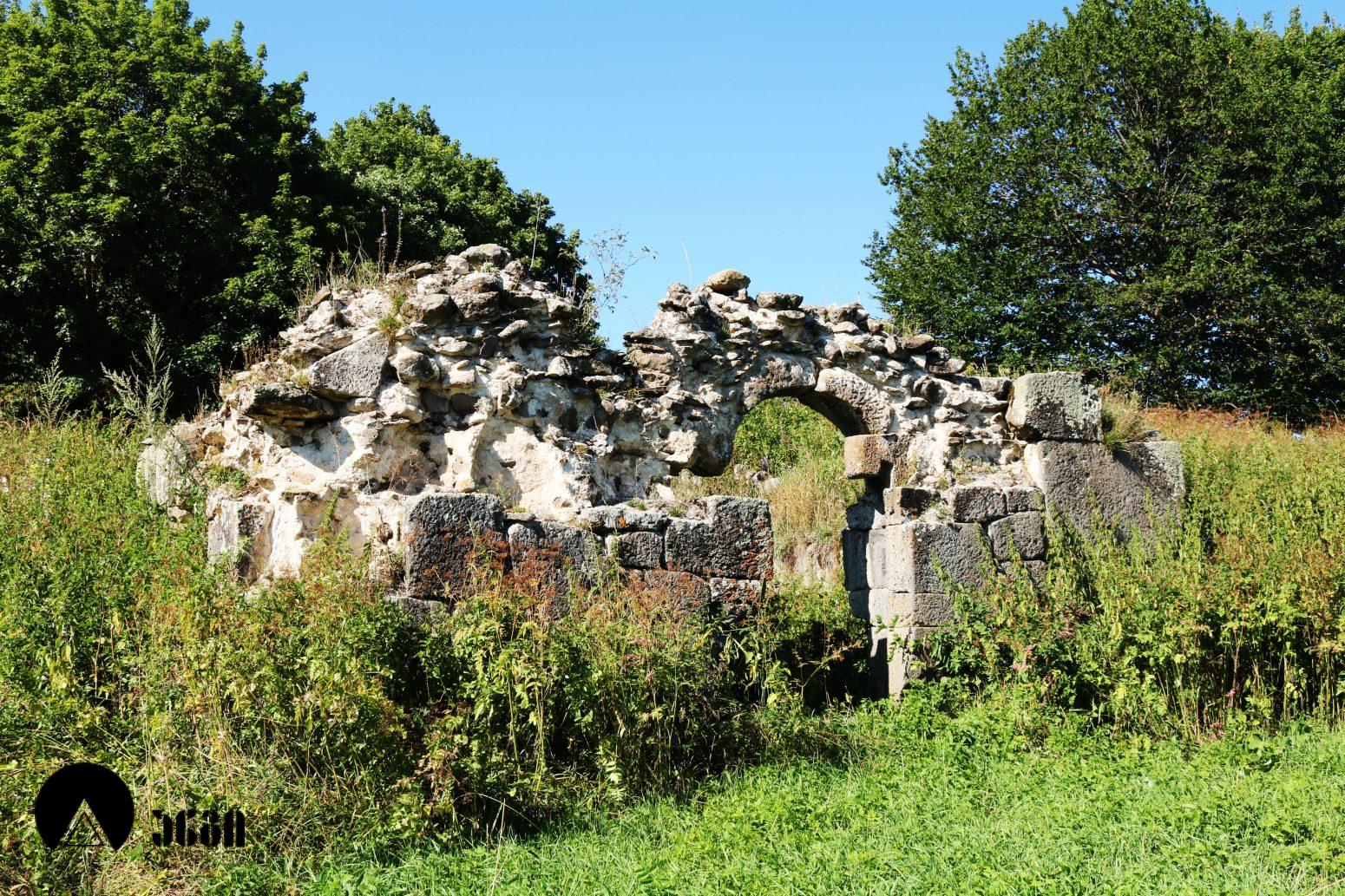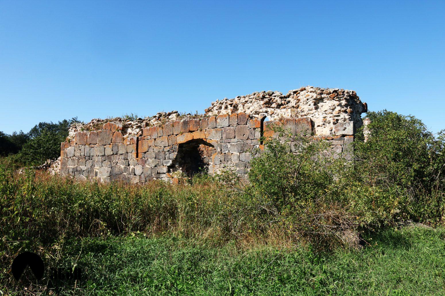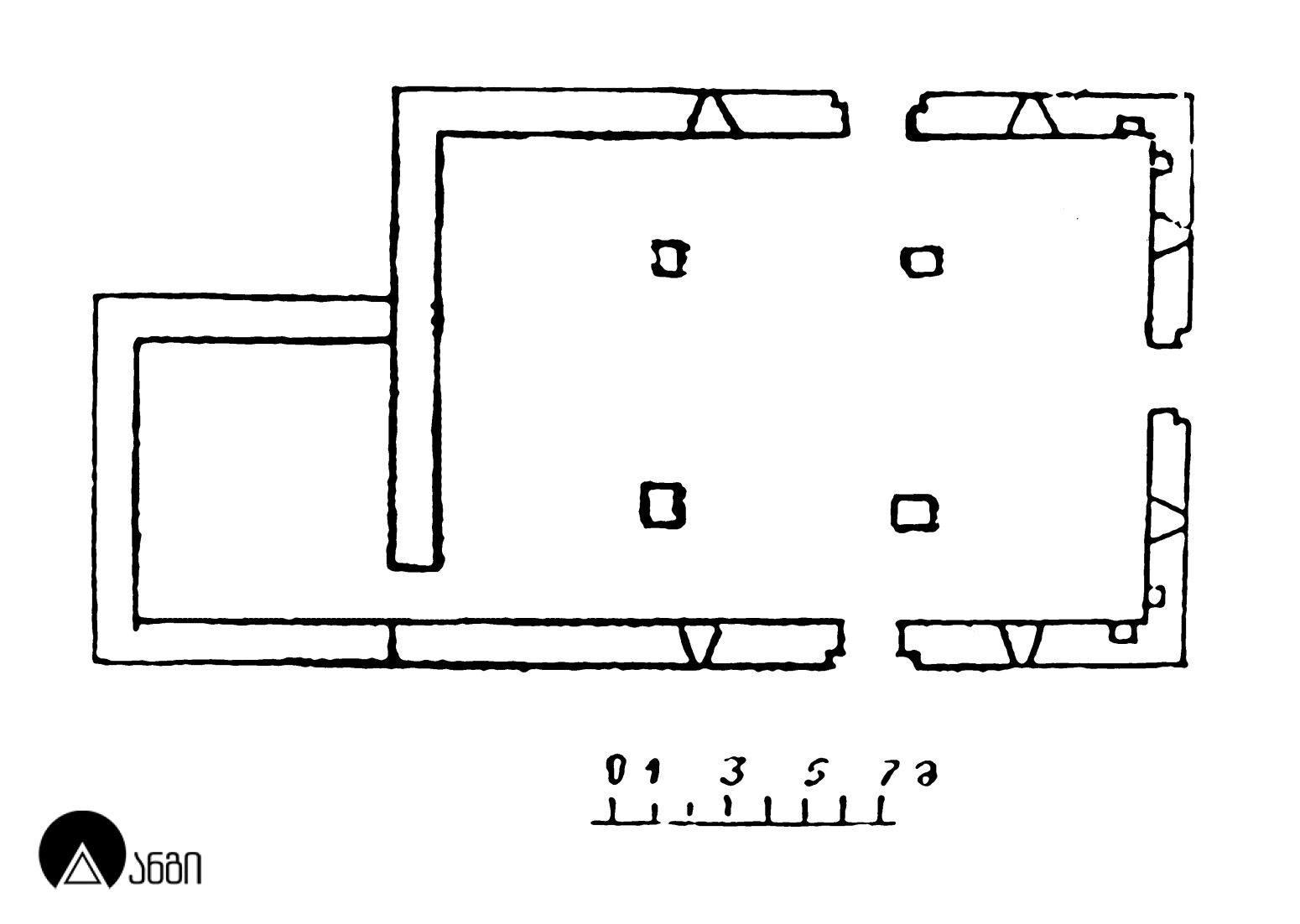 სასახლის დასავლეთით, დაახლოებით 20 მ-ის დაშორებით გეგმით წაგრძელებული ოთხკუთხედის ფორმის შენობა დგას, რომელიც სასახლის დამხმარე ნაგებობას წარმოადგენდა. შესასვლელი სამხრეთიდანაა, იგი გარედან არქიტრავულია, შიგნიდან კი თაღოვანი. შესასვლელში მოწყობილი ყოფილა საკეტის სისტემა. შემორჩენილია ორი სარკმელი, რომლებითაც შესასვლელია ფლანკირებული. ნაგებობის კედლებში დატანებულია სხვადასხვა ზომის თაღოვანი მაღალი ნიშები. იატაკი მომწვანო ფერის თხელი ქვის ფილებით ყოფილა მოგებული. კედლების გარეპირი სასახლის მსგავსადაა მოპირკეთებული. ნაგებობას შემოვლებული ჰქონია თლილი ქვის ერთსაფეხურიანი ცოკოლი. ამ შენობასა და სასახლეს შორის სწორკუთხა გეგმის აგურის ნაგებობის ნანგრევია, რომელიც აბანოს ან წყლის აუზს წააგავს.