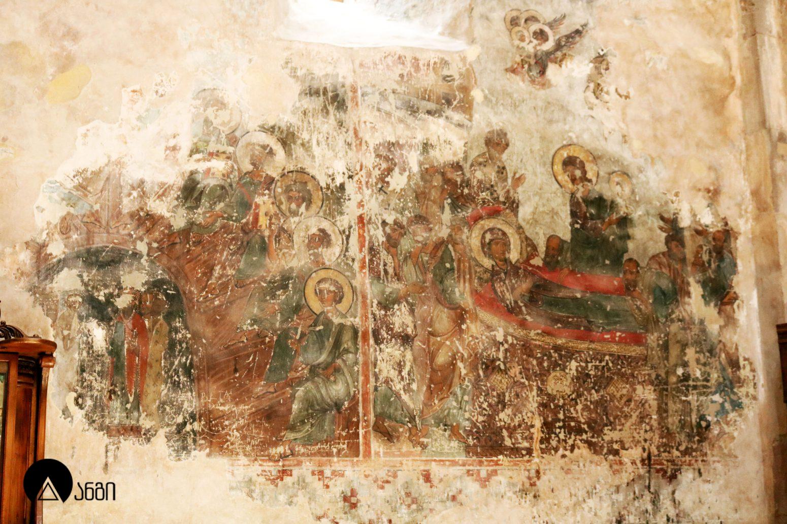 ღვთისმშობლის მიძინების ტაძარი დარბაზულ ნაგებობას წარმოადგენს, დასავლეთის მინაშენით. ეკლესიის აგების შესახებ ცნობები არ მოიპოვება, სტილისტური ნიშნებით იგი X საუკუნით თარიღდება. ტაძრის ლავგარდანში ჩართული ოსტატის რელიეფის წარწერის მიხედვით, ცნობილია მშენებელი ოსტატის სახელი – ვაჩე. შესასვლელი ორია – დასავლეთითა და ჩრდილოეთით (წმ. საბას ეკლესიიდან). დარბაზი აღმოსავლეთით ნახევარწრიული აფსიდით სრულდება. საკურთხეველი გამოყოფილი იყო მოჩუქურთმებული, ოსტატურად შესრულებული, დიდი მხატვრული ღირებულების მქონე, XI საუკუნის კანკელით, რომლის გადარჩენილი ნაწილები ამჟამად თბილისის ხელოვნების სახელმწიფო მუზეუმშია დაცული. დარბაზის დასავლეთ ნაწილში პატრონიკეა მოწყობილი, რომელიც დაყრდნობილია ორ წრიული გეგმის მქონე ბურჯსა და მათზე გადაყვანილ სამ თაღზე. ეკლესია ოთხი სარკმლით ნათდება, თითო სარკმელი აღმოსავლეთითა და დასავლეთითაა გაჭრილი, ორი კი – სამხრეთით, ერთი სარკმელი ჩრდილოეთის კედელშიც იყო, თუმცა წმ. საბას ეკლესიის აგების შემდეგ ეს სარკმელი გაუქმდა. გრძივი ფასადები ორსაფეხურიანი პილასტრებითა და მათ ქვედა საფეხურზე გადაყვანილი დეკორატიული თაღებითაა დანაწევრებული. პილასტრების ზედა საფეხურზებზე კამარის საბჯენი თაღებია გადაყვანილი. ინტერიერი მთლიანად მოუხატავთ XIV საუკუნეში, ბექა ათაბაგის შვილებს. ფრესკების ფრაგმენტები შემორჩენილია საკურთხეველში და პატრონიკეს ქვეშ, შუა თაღზე. მინაშენის სამხრეთ ნაწილში ლუნეტია, ადრე აქაც შესასვლელი ყოფილა, რომელიც რუს ბერებს თაღის ქუსლამდე ამოუშენებიათ. სამხრეთის ფასადს 3.5 მ-ის სიმაღლეზე თარო გასდევს, როგორც ჩანს, ამ მხარეს მინაშენი იყო გათვალისწინებული, რომლის კამარის საბჯენიც ეს თარო უნდა ყოფილიყო. ტაძრის საპერანგე წყობაში ორი ფენა გაირჩევა, არმოსავლეთის ფასადისა და სამხრეთის ფასადის ნაწილის პერანგი თავდაპირველია, დანარჩენი კი განახლებულია წმ. საბას ტაძრის აგების პერიოდში. პირვანდელი მორთულობა მხოლოდ აღმოსავლეთ ფასადზეა შემორჩენილი. ლავგარდნის წყობაში ჩასმულია რელიეფი მუხლმოდრეკილი ოსტატის – ვაჩეს გამოსახულებით და სარკმლის სათაური. დასავლეთ ფასადზე განახლების პერიოდის რელიეფებია – რვაქიმიანი ვარსკვლავი და ფრთოსანი ფიგურები. დასავლეთის მინაშენი მცენარეული და ზოომორფული მოტივებითაა შემკული. დასავლეთის კედელზე ჩასმულია ჯვრის ამაღლების რელიეფი, რომელიც სხვა ადგილიდანაა გადმოტანილი.
