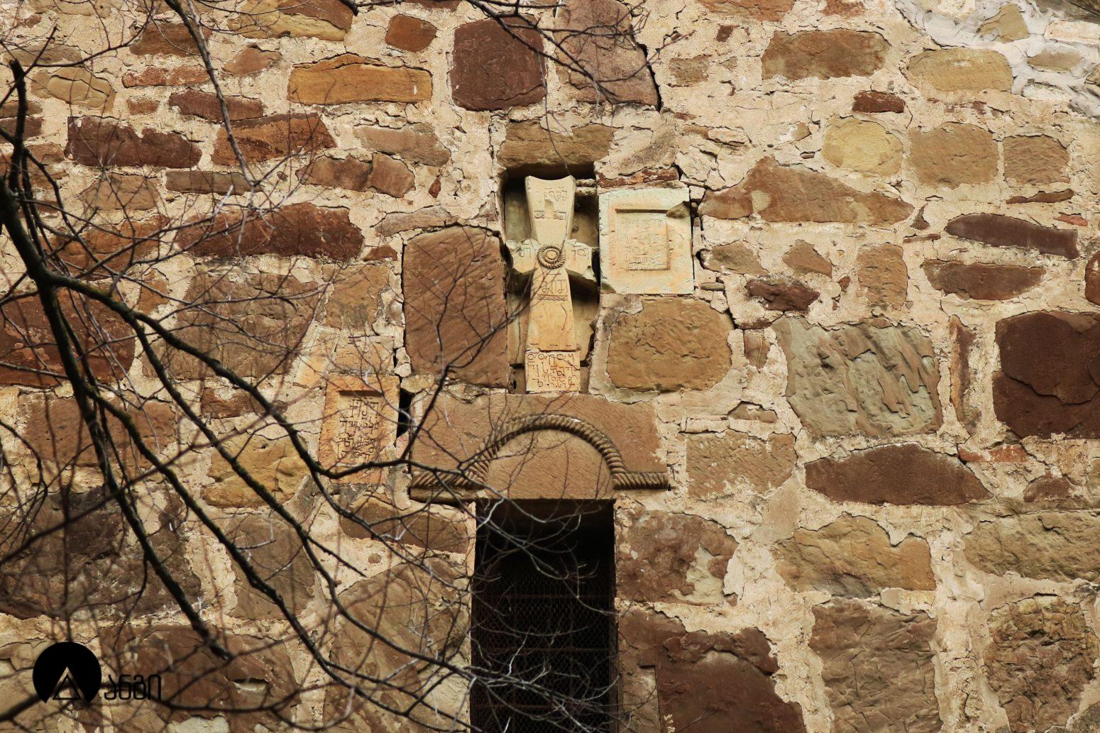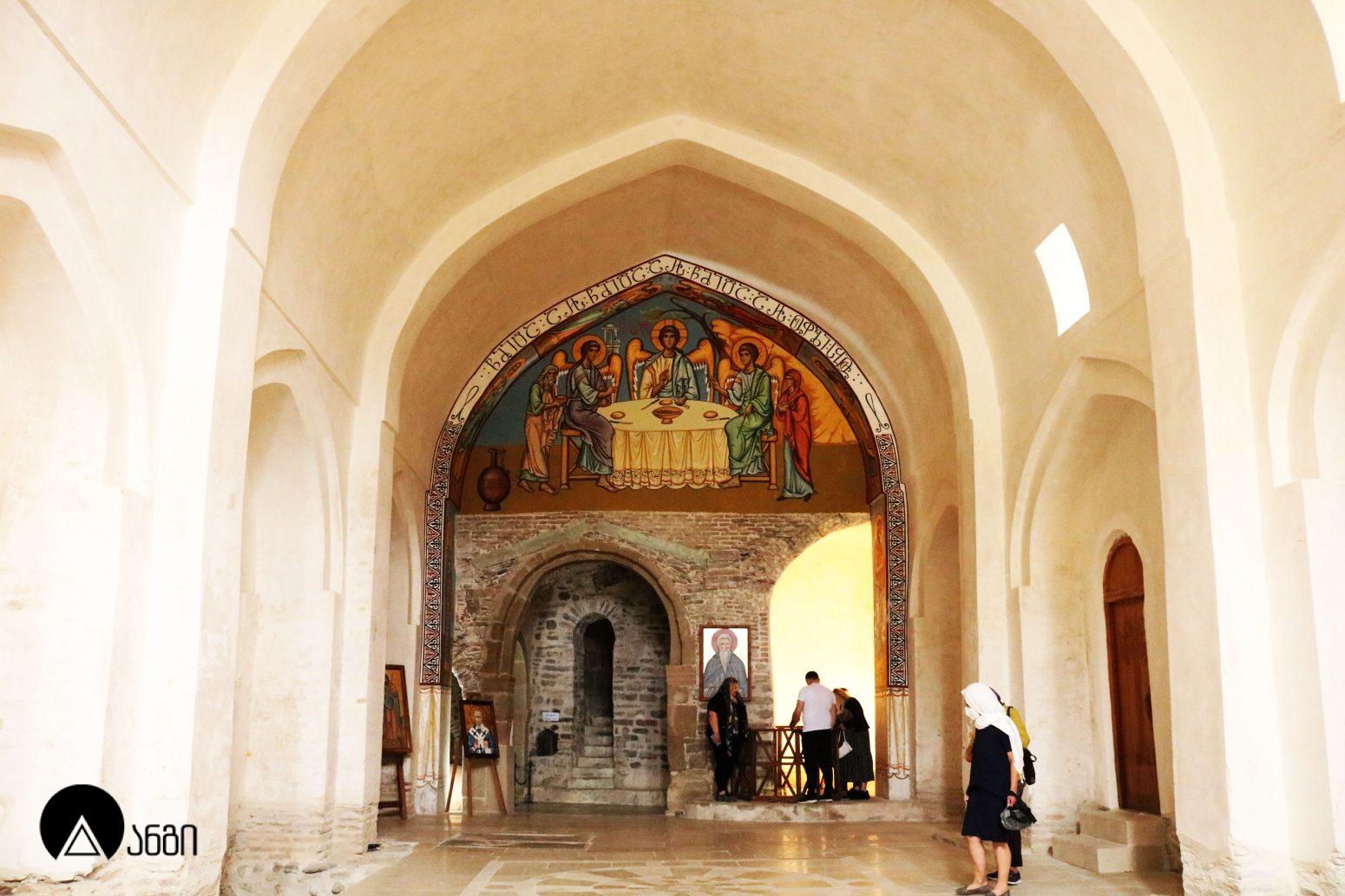 ჯვრის ამაღლების ეკლესია მონასტრის სამხრეთ-აღმოსავლეთით მდებარე კლდოვანი მთის წვერზე დგას. იგი XII საუკუნით თარიღდება. ეკლესია დარბაზულია. ნაგებია აგურით. შესასვლელი ერთია, ჩრდილოეთიდან. დარბაზი აღმოსავლეთით სწორკუთხედში ჩაწერილი ნახევარწრიული აფსიდით სრულდება. აფსიდი დარბაზისგან მხრებითაა გამოყოფილი. გრძივი კედლები ერთიანია, დაუნაწევრებელი. აფსიდის ჩრდილოეთ და სამხრეთ ნაწილებში თითო საშუალო და თითო პატარა ნიშია. ეკლესია სამი სარკმლით ნათდება, თითო სარკმელია გაჭრილი აფსიდში და სამხრეთისა და დასავლეთის კედლებში. ინტერიერში შემორჩენილია XIII საუკუნის მოხატულობა, თუმცა აფსიდში და სამხრეთის კედელზე უფრო ადრინდელი მოხატულობის კვალიც ჩანს. ყოველ კომპოზიციას ახლავს განმარტებითი ასომთავრული წარწერა. რეგისტრები არათანაბარი და არეულია. საკურთხევლის კონქში გამოსახულია ვედრება, მეორე რეგისტრში — თორმეტი მოციქულის ნახევარფიგურები, მესამე რეგისტრში — ეკლესიის მამები, აღმოსავლეთის სარკმლის ქვემოთ — ხატი მანდილისაი, სარკმლის წირთხლებზე — დიაკვანთა ფიგურები. დარბაზის სამხრეთ კედლის აღმოსავლეთ მონაკვეთიდან ჩრდილოეთ კედლის აღმოსავლეთ მონაკვეთამდე სადღესასწაულო ციკლის სცენებია: ხარება, შობა, მირქმა, ნათლისღება, ფერისცვალება, ლაზარეს აღდგინება, იერუსალიმში შესვლა და ჯვარცმა. ქვედა რეგისტრში ისტორიული თემები და ცალკეული ფიგურებია. სამხრეთ კედელზე წინასწარმეტყველთა წელსზედა გამოსახულებებია, მათ ქვემოთ — წინასწარმეტყველის მთლიანი ფიგურა, სარკმლის ქვემოთ — წმინდანის ნახევარფიგურა. კედლის ცენტრალურ ნაწილში გამოსახულია მესვეტე ორ ანგელოზთან ერთად, ხოლო მის გვერდით — ჯოჯოხეთის წარმოტყვევნა. დასავლეთ კედელზე — ამაღლება და სულთმოფენობა. ჩრდილოეთის კედელი ძალიან დაზიანებულია. კედლის აღმოსავლეთ მონაკვეთში ეკლესიის მამათა ფიგურებია, მათ ქვემოთ კი მოპირდაპირე, სამხრეთის კედლის ფიგურა მეორდება. ეკლესიის ფასადები მარტივი ლავგარდნით სრულდება. ეკლესიას ჩრდილოეთიდან უფრო გვიანდელი კარიბჭე-სამრეკლო ეკვრის. მისი პირველი სართული ეკლესიაში შესასვლელი კარიბჭეა, მეორე სართულზე კი სამრეკლოს ფანჩატურია.