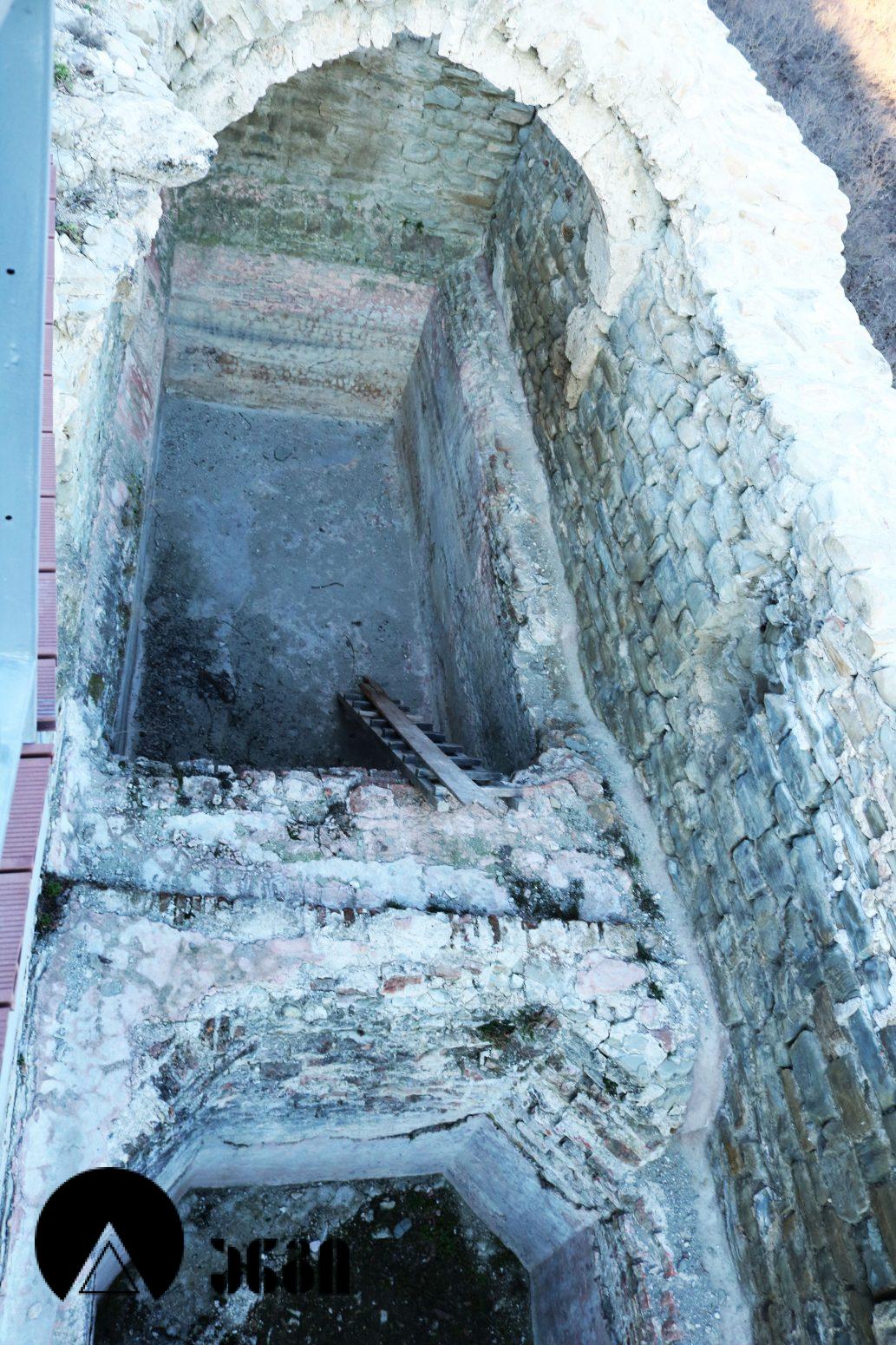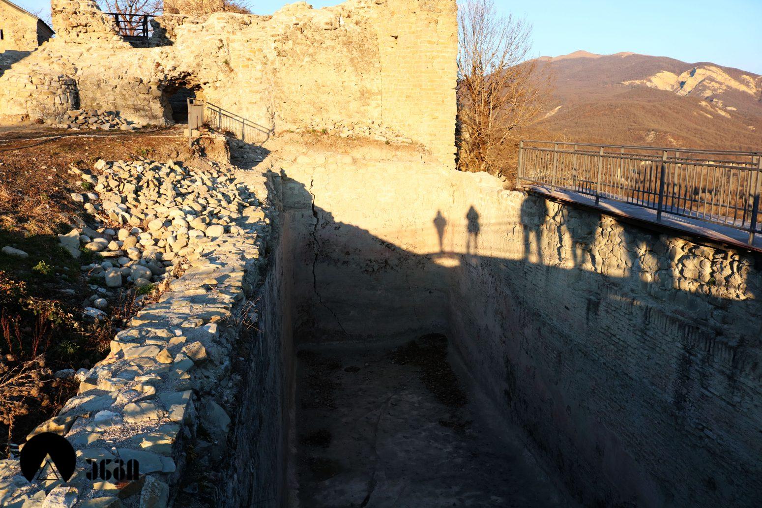 ეკლესიის მოპირდაპირე მხარეს, გალავანთან დიდი შენობაა, რომელშიც აღმოჩნდა მიწაში ჩაფლული ქვევრები და მრავალი არქეოლოგიური მასალა. შენობის ჩრდილოეთით წყალსაცავია. იგი გადახურულია კამარით, რომელიც სამ ნალისებრი მოხაზულობის გამბჯენ თაღს ეყრდნობა. თაღები შირიმის თლილი კვადრებითაა ამოყვანილი და პროფიოლირებული იმპოსტებს ეყრდნობიან. როგორც ჩანს პირვანდელი გრძელი შენობა მოგვიანებით გადაუკეთებიათ და მასში ორი აუზი მოუწყვიათ, მათ შორის კი კედელი-ზღუდარია. აუზის კედლები შიგნიდან შელესილია ვარდისფერი ჰიდრავლური ხსნარით, კირში კერამიკული დანამატებით. დიდი წყალსაცავის დასავლეთის მხრიდან მომიჯნავე კოშკის ქვედა სართულში კიდევ ერთი მცირე ზომის წყალსაცავია მოწყობილი. წყალსაცავის თავზე გვიანფეოდალურ ხანაში ახლიდან აუგიათ ოთხკუთხა კოშკი. ჩრდილო-დასავლეთის კოშკი ოთხკუთხა მოხაზულობის ყოფილა, როგორც ჩანს, იგი თითქმის მთლიანად დაუნგრევიათ და X-XI საუკუნეებში მის ჩრდილო-დასავლეთის კუთხეში მომრგვალო გოდოლი აუგიათ. გვიანფეოდალურ ხანაში სამხრეთის მხრიდან კოშკი გკედლითა და ბურჯით გაუმაგრებიათ. კოშკის სამხრეთით მეორე კოშკის ნანგრევია, რომელიც დანგრევის შემდეგ კოშკი ნახევარწრიული ბურჯებით გაუმაგრებიათ. უჯარმის ციხის უძველესი პერიოდის ნაგებობები მკვეთრად გამოირჩევა მომდევნი პეიოდის ნაგებობებისაგან. პირვენდელი შენობები აგებულია თანაბარი სიმაღლის სწორკუთხოვანი მოყვანილობის კვადრების რეგულარული წყობით თხელ დუღაბზე. ყველა ნაგებობის კედლის სისქე თანაბარია, ფართო კარ-სარკმლები ნალისებურთაღოვანია. შენობები დახურულია დიდი ზომის ბრტყელი და ღარისბრი კრამიტით.