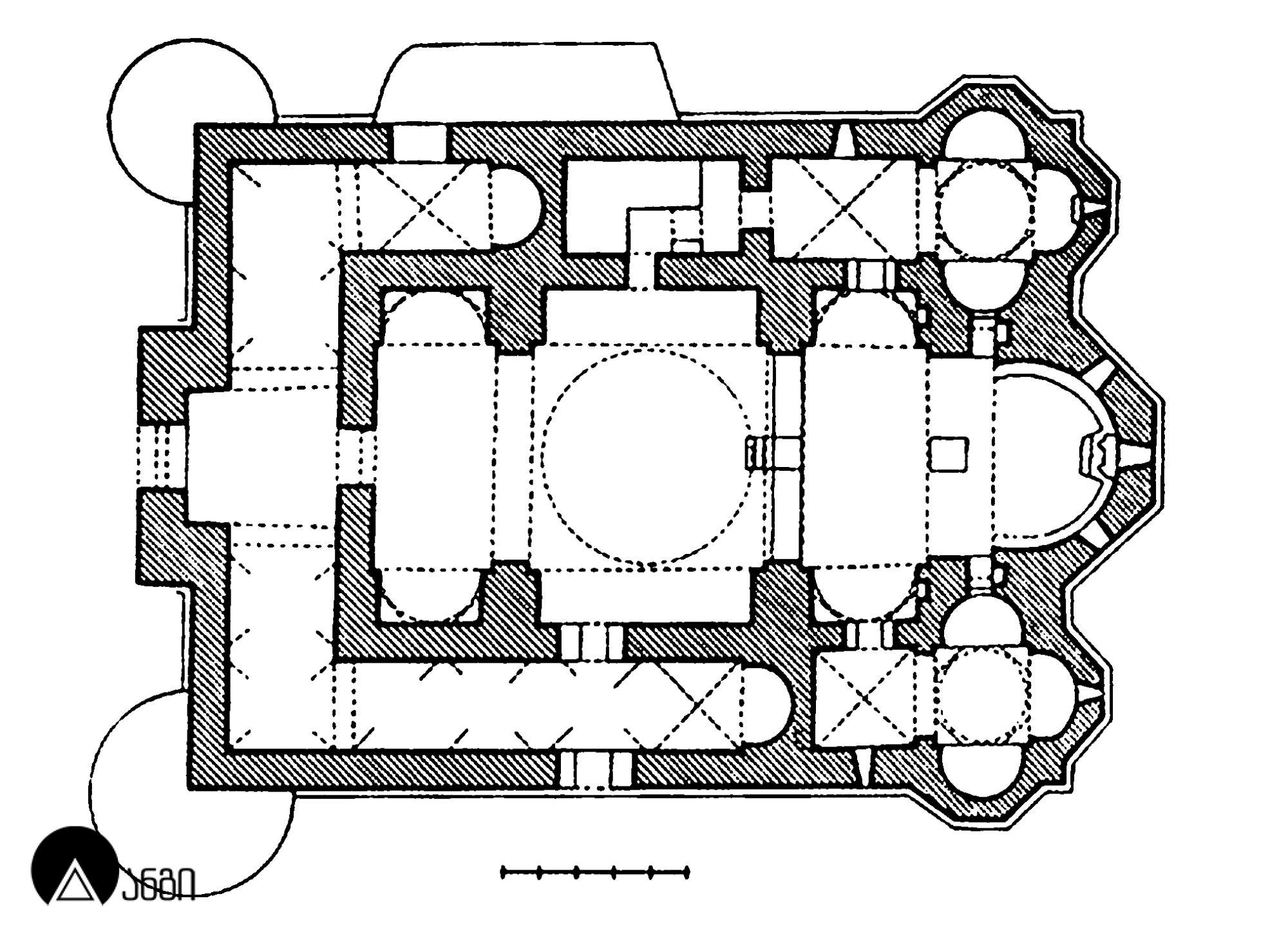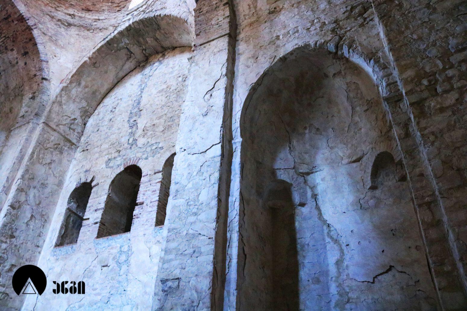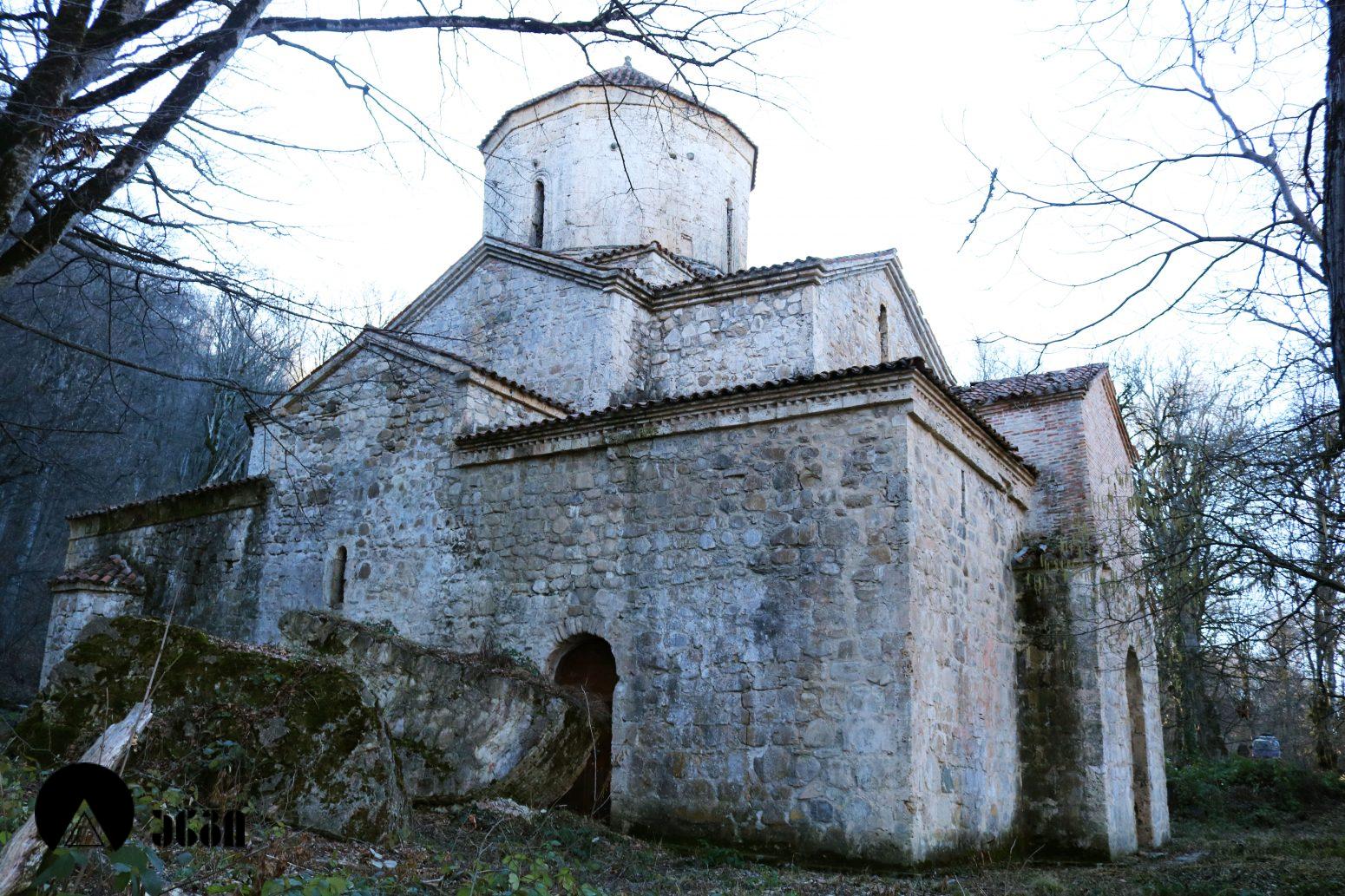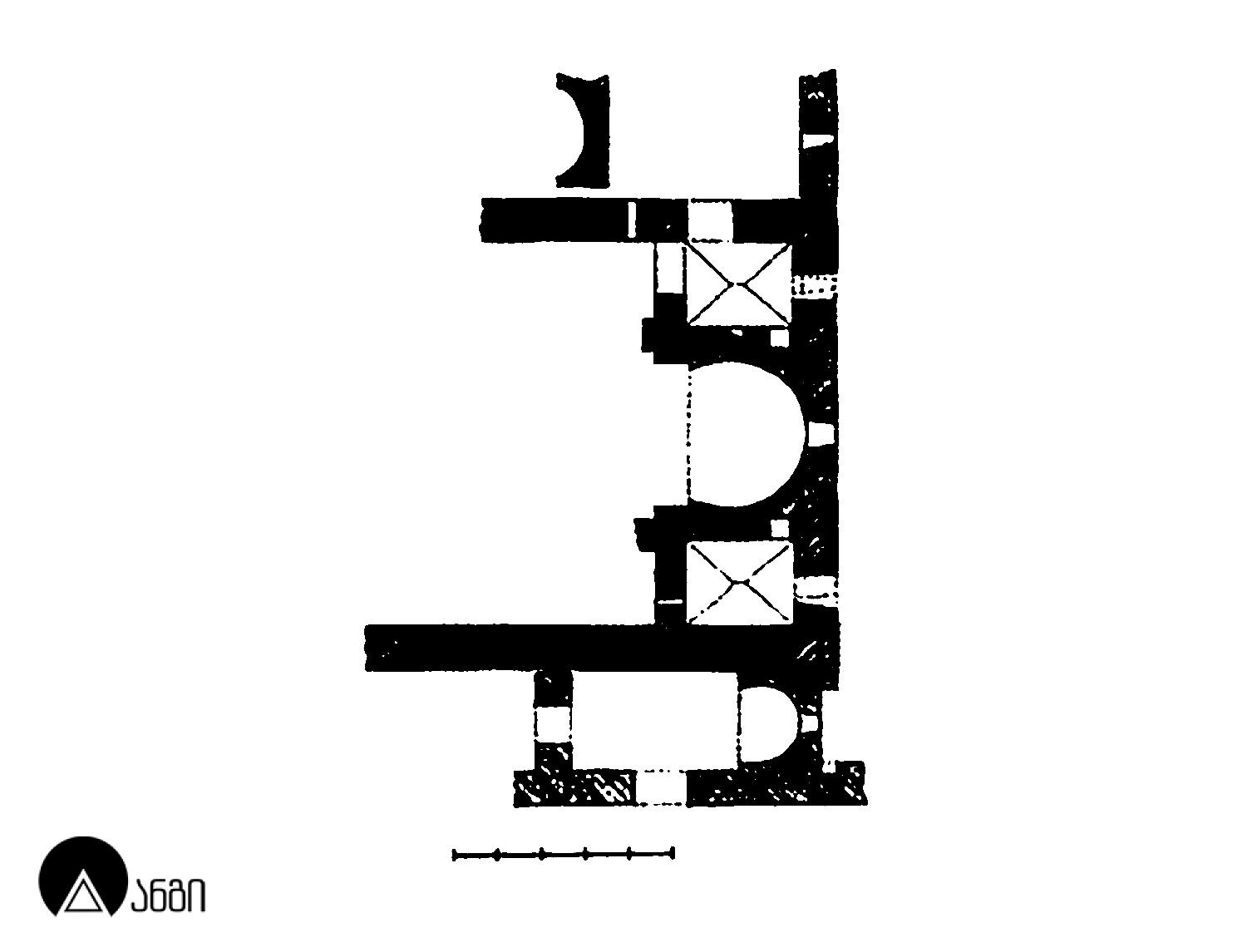 ნაგებობა სამნავიანი ბაზილიკა ყოფილა, რომელსაც მთელს სიგრძეზე დამატებითი სათავსები და გალერეები გასდევდა (შესაძლოა დასავლეთიდანაც). ნავთა გამყოფი ბურჯები და თაღები შემორჩენილი არ არის. ეკლესია ნაგებია რიყის ქვითა და აგურით, კუთხეებისა და კონსტრუქციული ელემენტებისთვის თლილი შირიმია გამოყენებული. მთავარი ნავი აღმოსავლეთით კონქით გადახურული ნალისებრი აფსიდით სრულდება. აფსიდის წინ მცირე სიღრმის ბემაა. საკურთხეველი სამნაწილიანია — აფსიდის ორივე მხარეს სწორკუთხა დამხმარე სათავსია (პირობითად — პასტოფორიუმები), რომლებიც შესაბამის ნავებს დასავლეთ კედელში მოწყობილი თაღოვანი კარით უკავშრდება. სათავსებს შესასავლელები აღმოსავლეთინაც აქვთ (პასტოფორიუმის აღმოსავლეთ კედელში გაჭრილი შესასვლელი გააჩნია ანჩისხატის ბაზილიკასაც). ჩრდილოეთ პასტოფორიუმი კარით უკავშირდება ჩრდილოეთ გალერეის აღმოსავლეთ ნაწილში არსებულ სწორკუთხა სათავსსაც. ჩრდილოეთ გალერეის დასავლეთ ნაწილი აღმოსავლეთით აფსიდით სრულდება. სამხრეთ გალერეის აღმოსავლეთ ნაწილში აფსიდალური ეკვდერია გამოყოფილი, რომლის ქვეშ კრიპტაა მოწყობილი. ეკვდერს ორი თაღოვანი შესასვლელი აქვს — დასავლეთიდან და სამხრეთიდან. სამხრეთის ეკლესიის იატაკი მთავარი ნავის იატაკთან მიმართებით, ოდნავ მაღალია, რაც ნაგებობის ქვეშ არსებული კამაროვანი კრიპტით არის განპირობებული. აფსიდში ერთი ნალისებრი სარკმელია გაჭრილი. თითო თაღოვანი სარკმელი აქვთ აღმოსავლეთით დამხმარე სათავსებსაც. სარკმელთა გადამხურავი თაღები შირიმის ერთიან ქვაშია გამოჭრილი. მთავარი ნავი, გვერდითებთან შედარებით, უფრო მაღალი და განიერია. მთავარ ნავს ორკალთა გადახურვა აქვს, გვერდინა ნავებს კი — ცალფერდა. გვერდითა ნავებთან შედარებით, უფრო დაბალია გალერეები და მათაც ცალფერდა გადახურვა აქვთ. შესაბამისად, აღმოსავლეთ ფასადს ხუთნავიანი ბაზილიკის აბრისი აქვს. მთავარი ნავის აფსიდის სარკმელი სადა ჰორიზონტალურ გადანაკეცებიანი თავსართითაა დეკორირებული. სამხრეთ ეკვდერის აღმოსავლეთ ფასადზე დიდი, ღრმა, თაღოვანი ნიშაა. ნიშის თაღი დახრილი სიბრტყის ფორმის შირიმის სადა იმპოსტებს ეყრდნობა, ასეთივე იმპოსტებს ეყრდნობა ეკვდერის დასავლეთ შესასვლელის თაღიც. ბაზილიკა და ეკვდერ-გალერეები ერთიანი წყობით არ არის ნაგები, თუმცა ისინი თანადროულია.