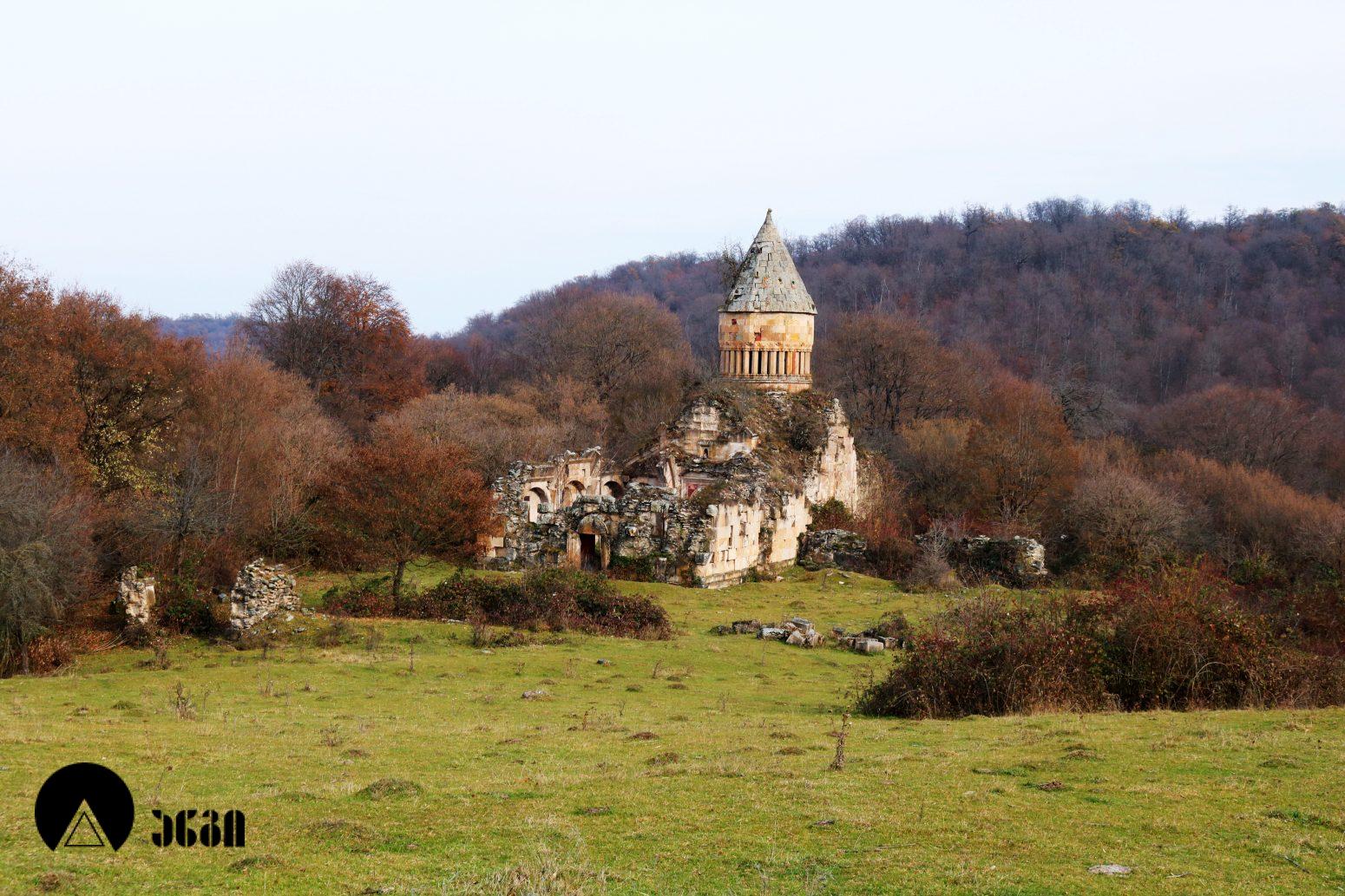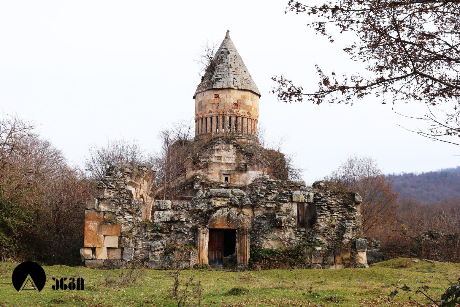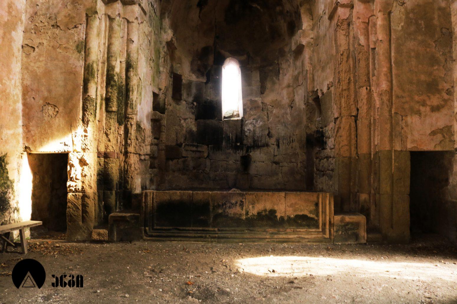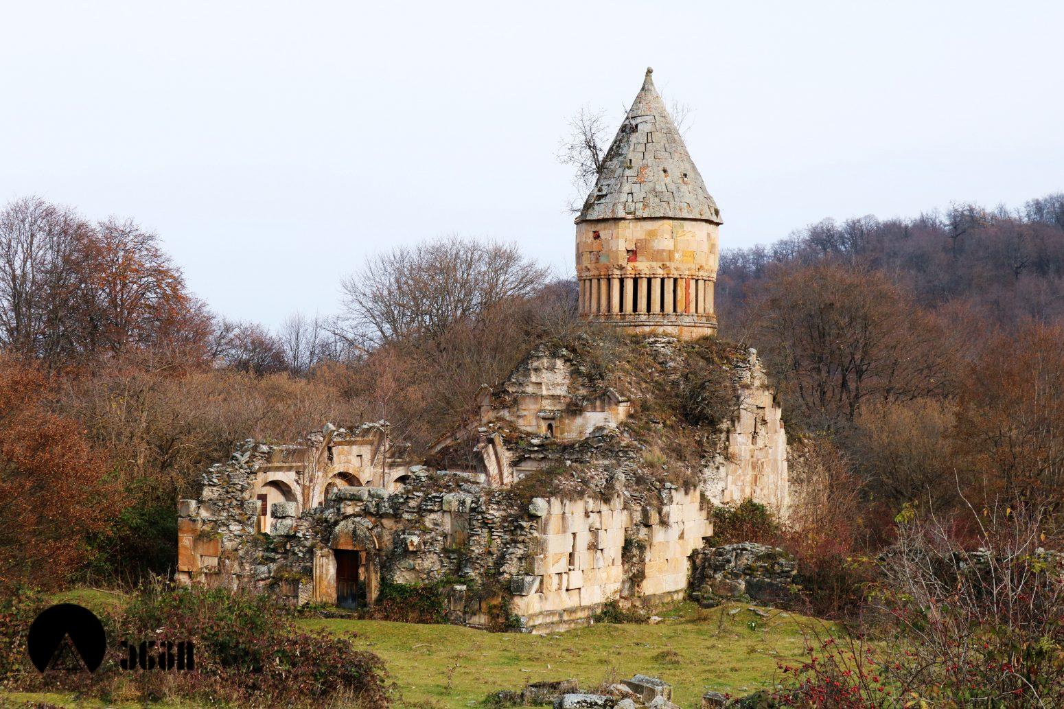 ანსამბლის მთავარი ნაგებობა გუმბათოვანი ტაძარია, რომელიც ჩახაზული ჯვრის ტიპის ჯვარ-გუმბათოვან ნაგებობას წარმოადგენს. შესასვლელი ორია – დასავლეთითა და სამხრეთით. ეკლესიას დასავლელით გავითი აქვს მიდგმული. დარბაზის აღმოსავლეთით საკურთხევლის ნახევარწრიული აფსიდია, რომელიც მთავარი სივრცისგან არდაბაგითაა გამოყოფილი. აფსიდი ბემითაა დაგრძელებული. ჯვრის მოხაზულობის ცენტრალურ სივრცეს კუთხეებში აფსიდიანი, იზოლირებული სამლოცველოები აქვს დამატებული. გუმბათქვეშა კვადარტის კუთხეები სამ-სამი მრგვალი ნახევარსვეტითაა გაფორმებული, რომლებზეც ნახევარწრიული თაღებია გადაყვანილი. კვადრატიდან გუმბათის წრიულ ყელზე გადასვლა აფრებით ხორციელდება. გუმბათის ყელის საფუძველზე ერთმანეთთან მჭიდროდ განლაგებული ოცდათი ექვსწახნაგა სვეტია, რომელსაც გუმბათის ათწახნაგა ყელი და კამარა ეყრდნობა. ინტერიერში სვეტების ზემოთ გუმბათის ყელი არ გრძელდება, კამარასა და სვეტებს შორის მხოლოდ დეკორირებული სარტყელია. გუმბათის ნახევარსფეროს მზიდ კონსტრუქციას ექვსი ურთიერთგადამკვეთი თაღი ქმნის, რომლებიც ექვსწახნაგა ვარსკვლავს გამოსახავენ და მხატვრული ფუნქციაც გააჩნიათ. ინტერიერი შელესილია, თუმცა, როგორც ჩანს, თავიდან შეულესავი უნდა ყოფილიყო, რადგან ჩამოცვენილი ბათქაშის ადგილას რელიეფური დეტალები ჩანს. ტაძრის ყველა მკლავში თითო თაღოვანი სარკმალია, თითო თაღოვანი სარკმელი აქვთ აგრეთვე აღმოსავლეთის აფსიდის გვერდით მდებარე სამლოცველოებს. ექსტერიერში აფსიდსა და სამლოცველოებს შორის სამკუთხა ნიშებია, რომლებიც მცირე ზომის, სიღრმეში განთავსებული მარაოსებრი დეკორითაა შემკული. ფასადები, გარდა გუმბათისა, თითქმის მოურთველია, მხოლოდ სარკმლებს აქვს ლილვოვანი საპირეები და შესასვლელებს ასევე საკმაოდ მარტივი დეკორი. ტაძრის ძირითადი კორპუსის საპერანგე წყობის მნიშვნელოვანი ნაწილი ჩამოცვენილია. გუმბათის სვეტებს სამფურცლა და ოთხფურლა, ყვავილისებრი მორთულობა გასდევს. გუმბათის ყელზე მიმობნეულია მცენარეული და გეომეტრიული რელიეფები და ჯვრები და გრეხილი ლილვის ლავგარდანი ასრულებს. ტაძრის ფასადებს წრეთარგისა და ლილვისგან შედგენილი ლავგარდანი შემოუყვება. ტაძრის სამხრეთ შესასვლელთან სახურავის კეხი დევს ლომის რელიეფური გამოსახულებით. ეკლესიის დასავლეთ ფასადზე მიდგმული გავითი გეგმით კვადრატული მოხაზულობისაა. გავითის კედლები ინტერიერში მსხვილი პილასტრებითა და მათ შორის გადაყვანილი თაღებითაა დანაწევრებული. გავითის კედლებსა და ეკლესიის შესასვლელ