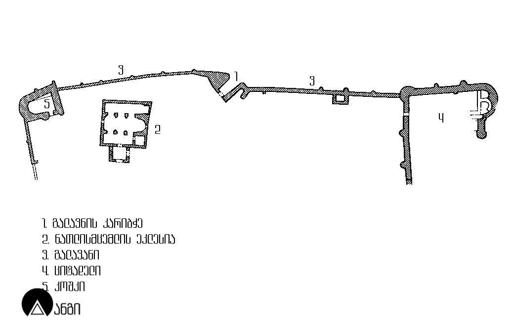 ციხე-გალავანი ეკლესიას სამი მხრიდან ევლება. იგი ძირითადად XVII საუკუნით თარიღდება, ზოგიერთი ნაწილი კი განვითარებულ ფეოდალურ ხანას მიეკუთვნება. გალავნის შესასვლელი ეკლეესიის ჩრდილო-დასავლეთ მხარესაა, იგი კოშკითა და ბურჯითაა გამოყოფილი. შესასვლელის დასავლეთ წირთხლში კვადრია ჩასმული XV საუკუნის მხედრული წარწერით (წარწერა დაზიანებულია). შესასვლელთან მდგარ კოშკს გეგმით უსწორო წრის ფორმა აქვს. მასიური პირველი სართული ბურჯის მსგავსია. კოშკში შესასვლელი მეორე სართულზეა. გალავნის ჩრდილო-დასავლეთის კუთხეში მდგარი კოშკი გეგმით უსწორი მართკუთხედია. კარი და კოშკის იატაკი მიწის დონიდან შემაღლებულია. გალავნის დასავლეთისა და ჩრდილოეთის კედლებთან, საძირკვლის დონეზე, შემორჩენილია ნაგებობათა ნაშთები. გარედან გალავანი გამაგრებულია ნახევარწრიული კონტრფორსებით. გალავნის აღმოსავლეთით ციტადელის ნანგრევებია. ციტადელში შესასვლელი დასავლეთიდანაა. შიდა ეზოში ჩანს ნაგებობათა კვალი.